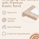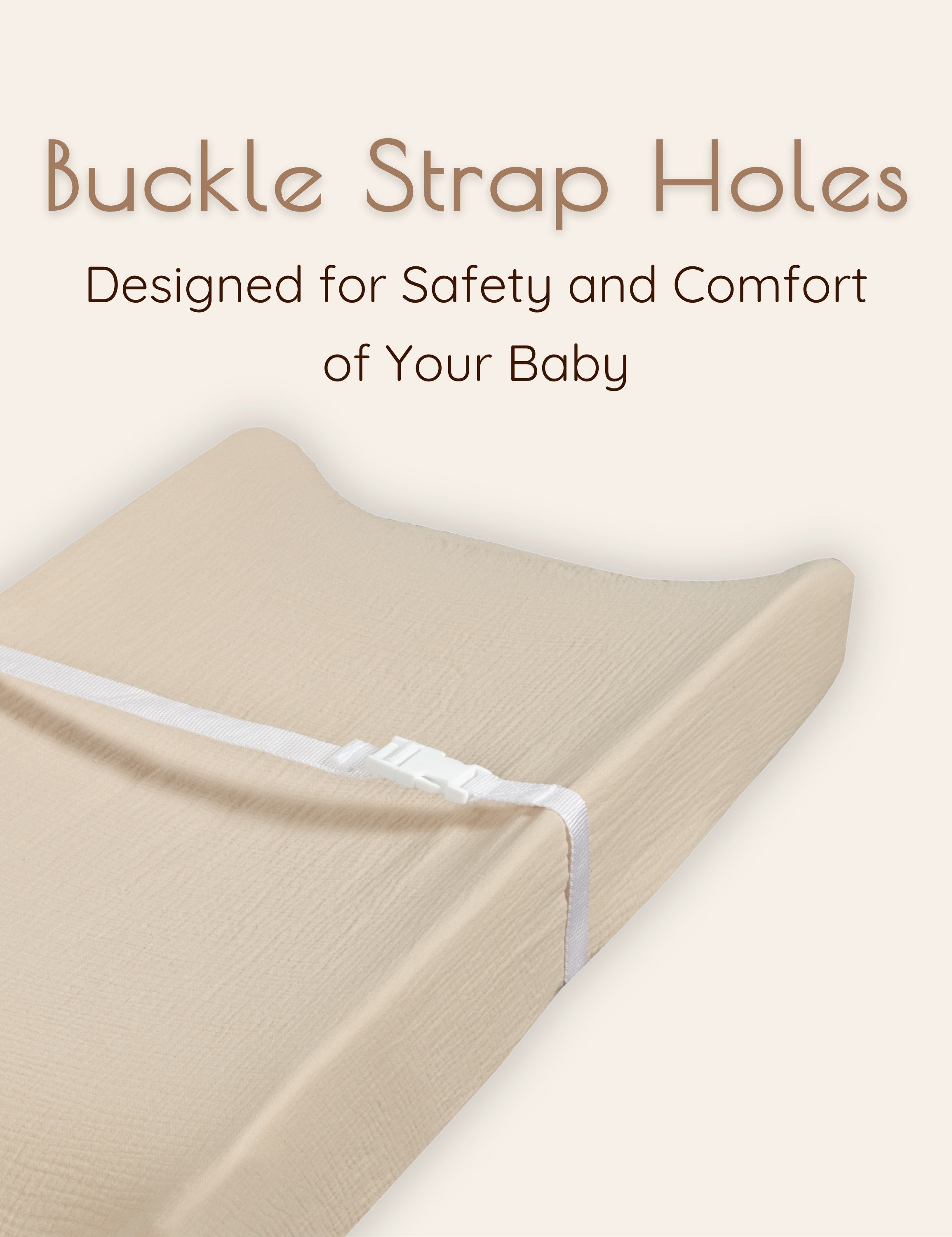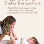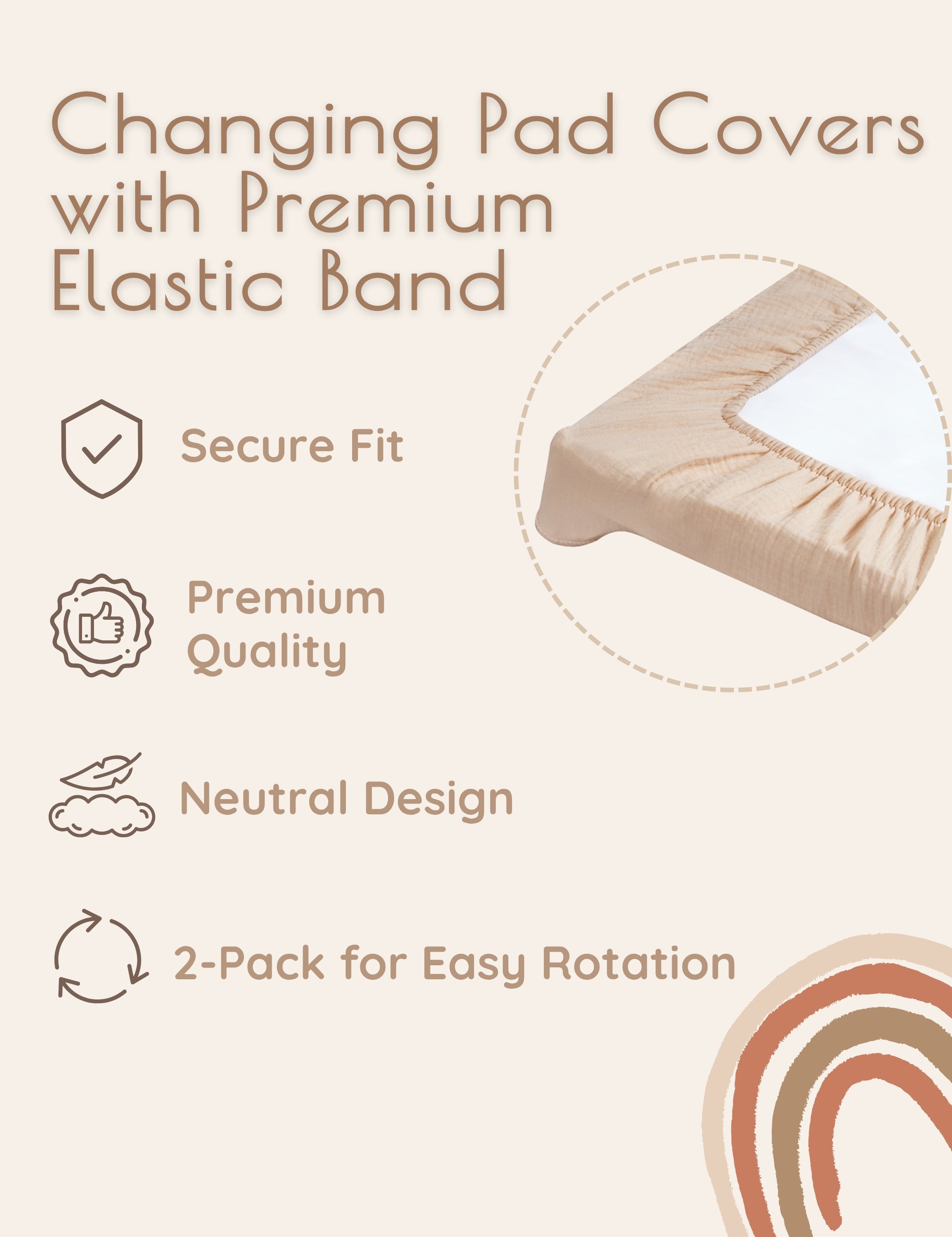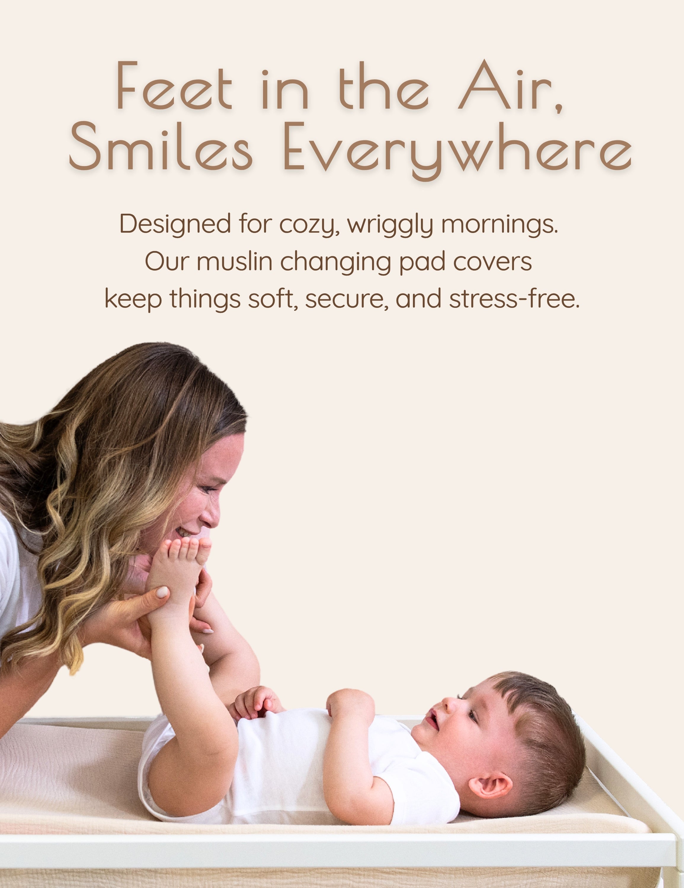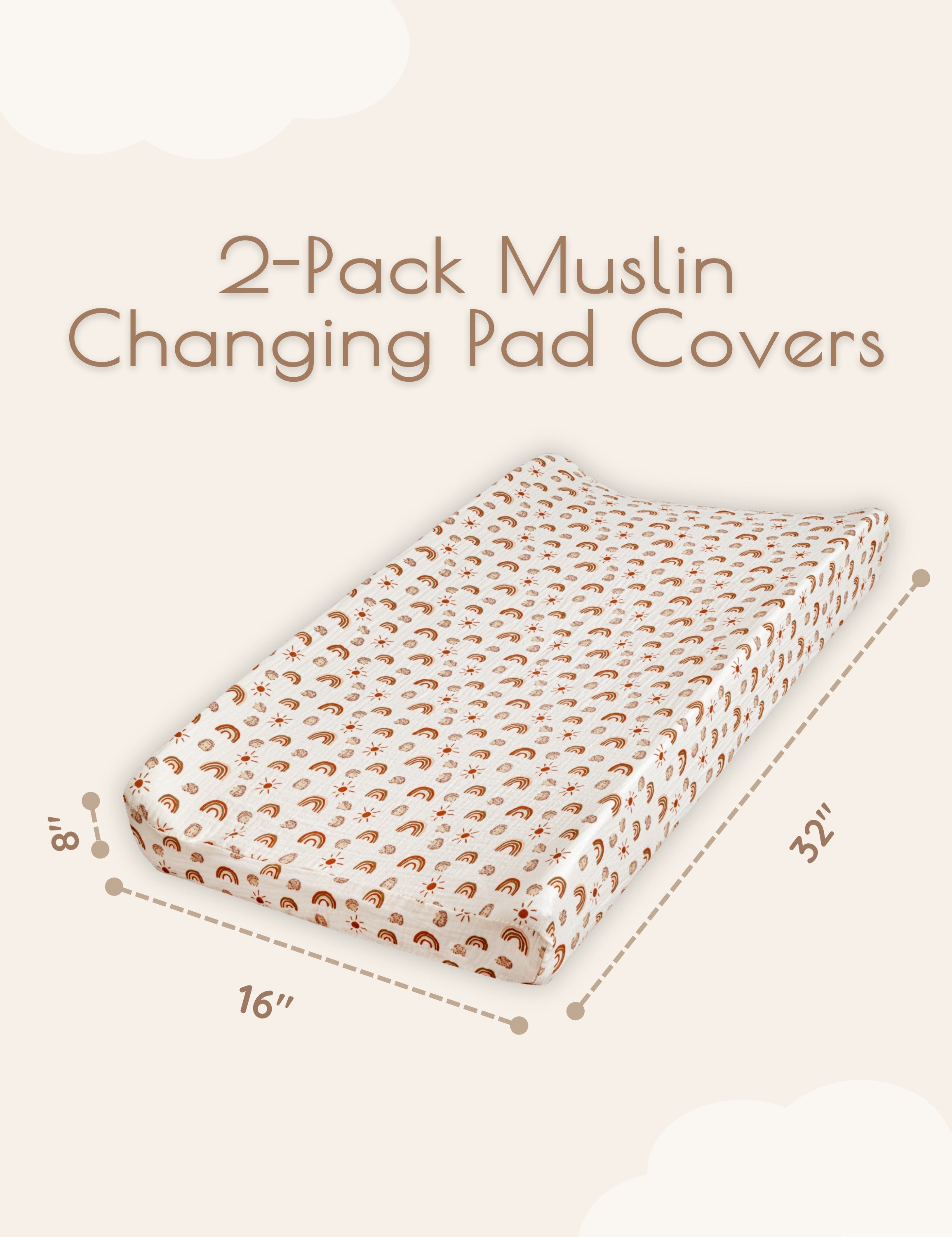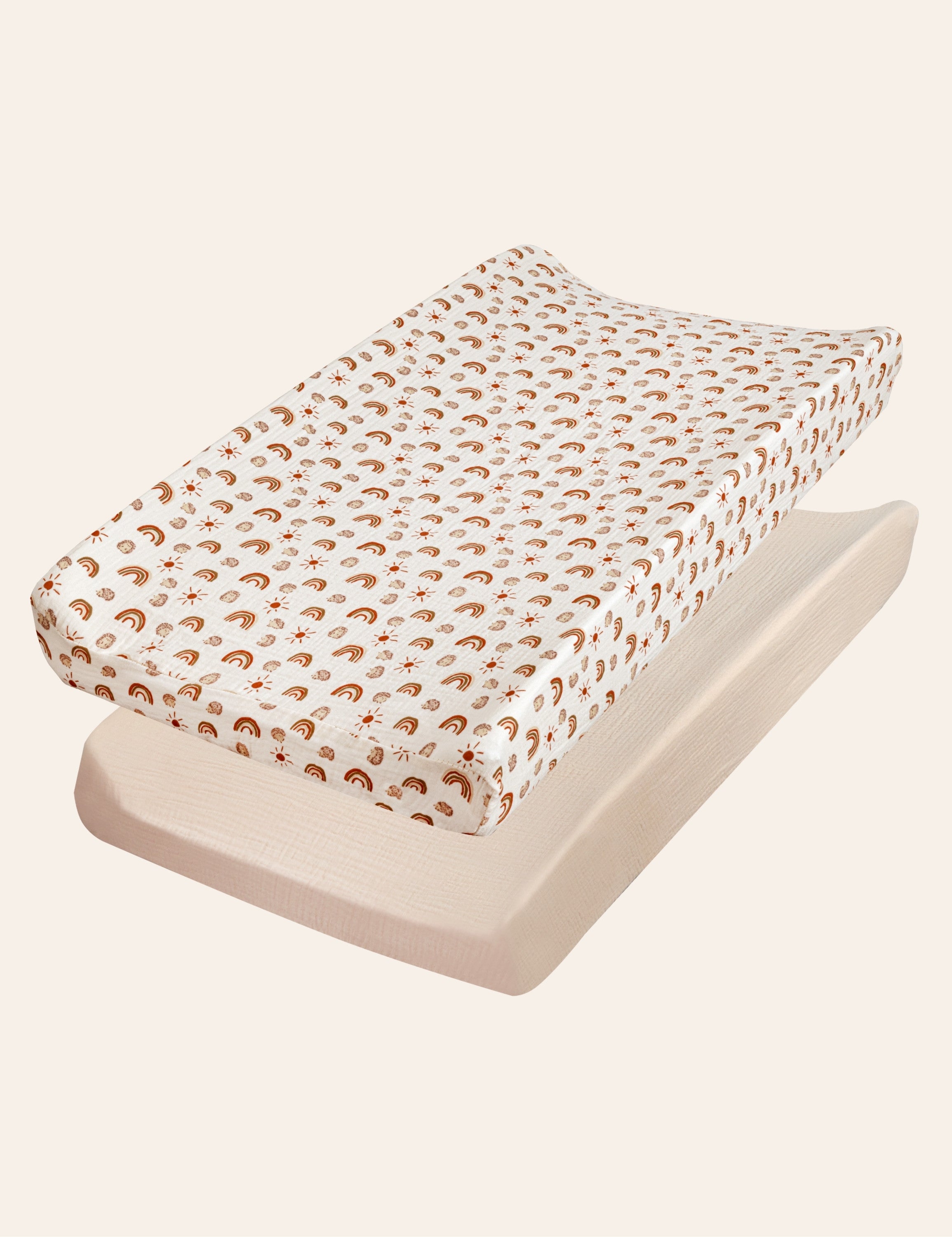 Material: 100% Muslin Cotton. These diaper changing pad covers are crafted from lightweight, breathable, OEKO-TEX® certified muslin for everyday softness and skin safety. The natural, gentle texture makes these changing pad covers ideal for daily diaper changes.
