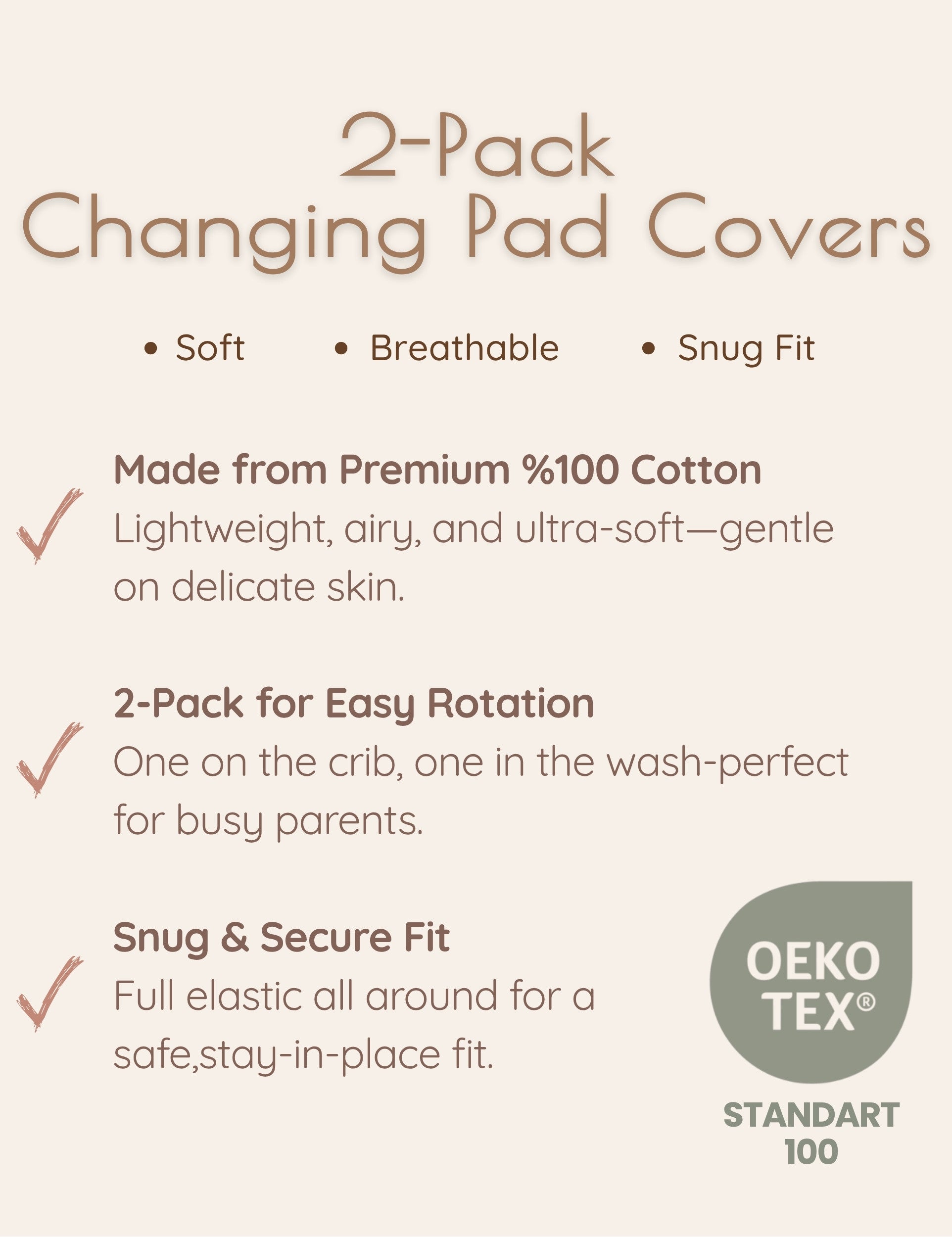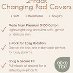 Material: 100% Cotton. OEKO TEX certified, this 2-pack cotton changing pad cover set is crafted from soft, breathable cotton that keeps your baby comfortable during every diaper change.
