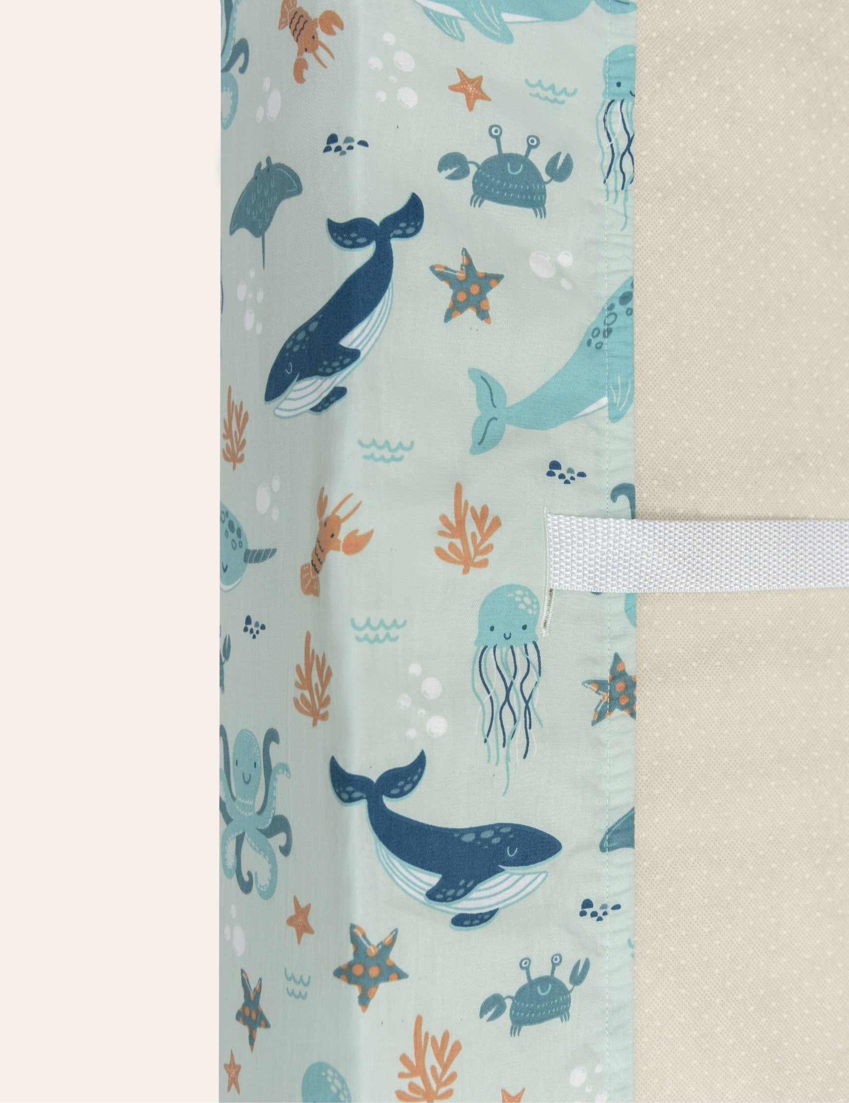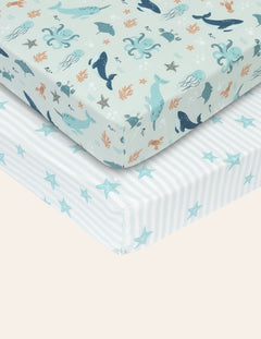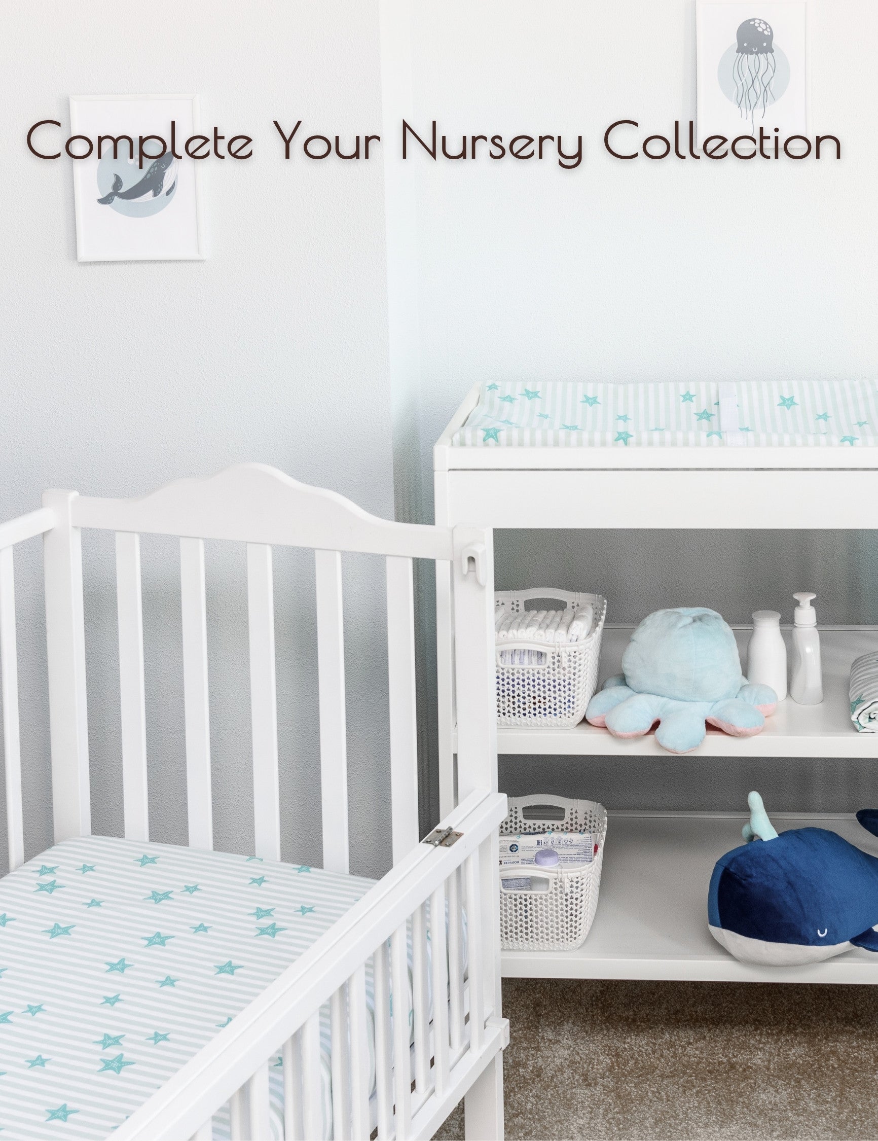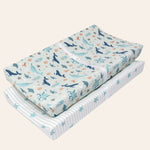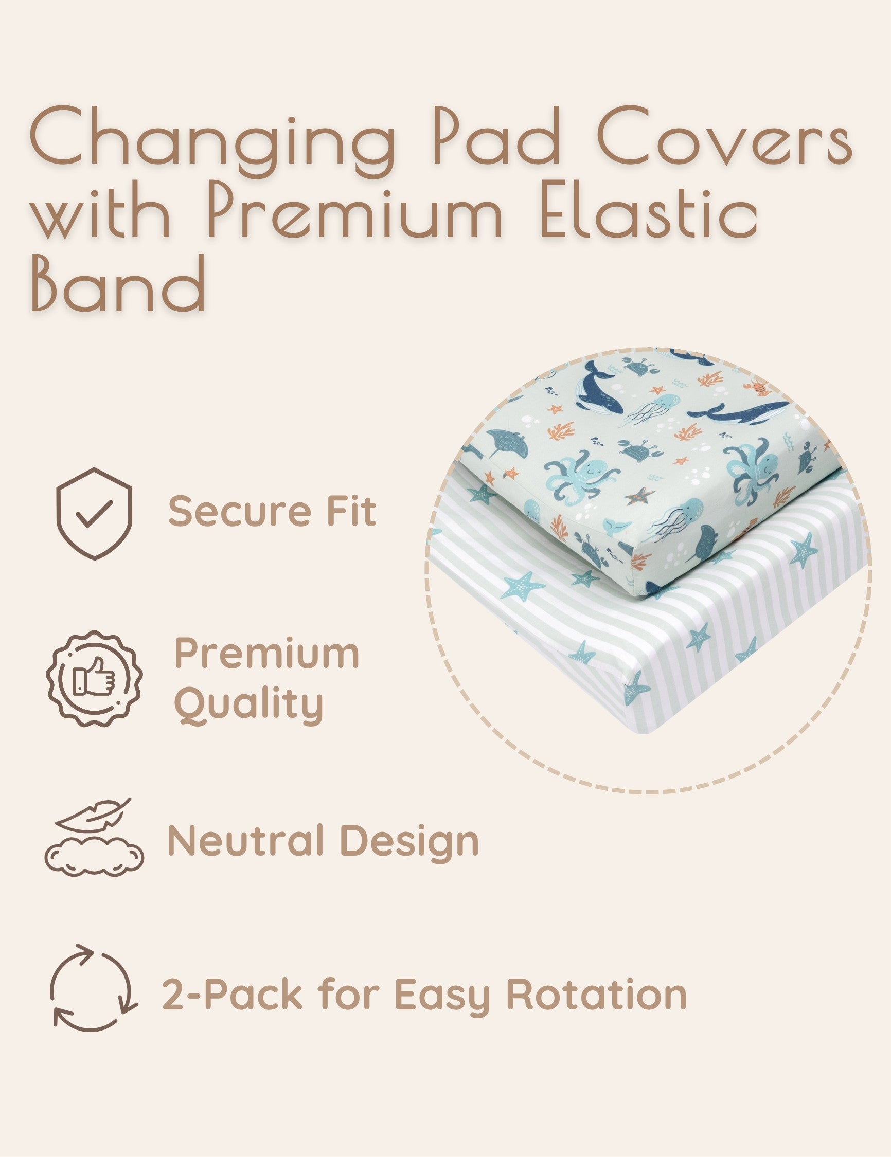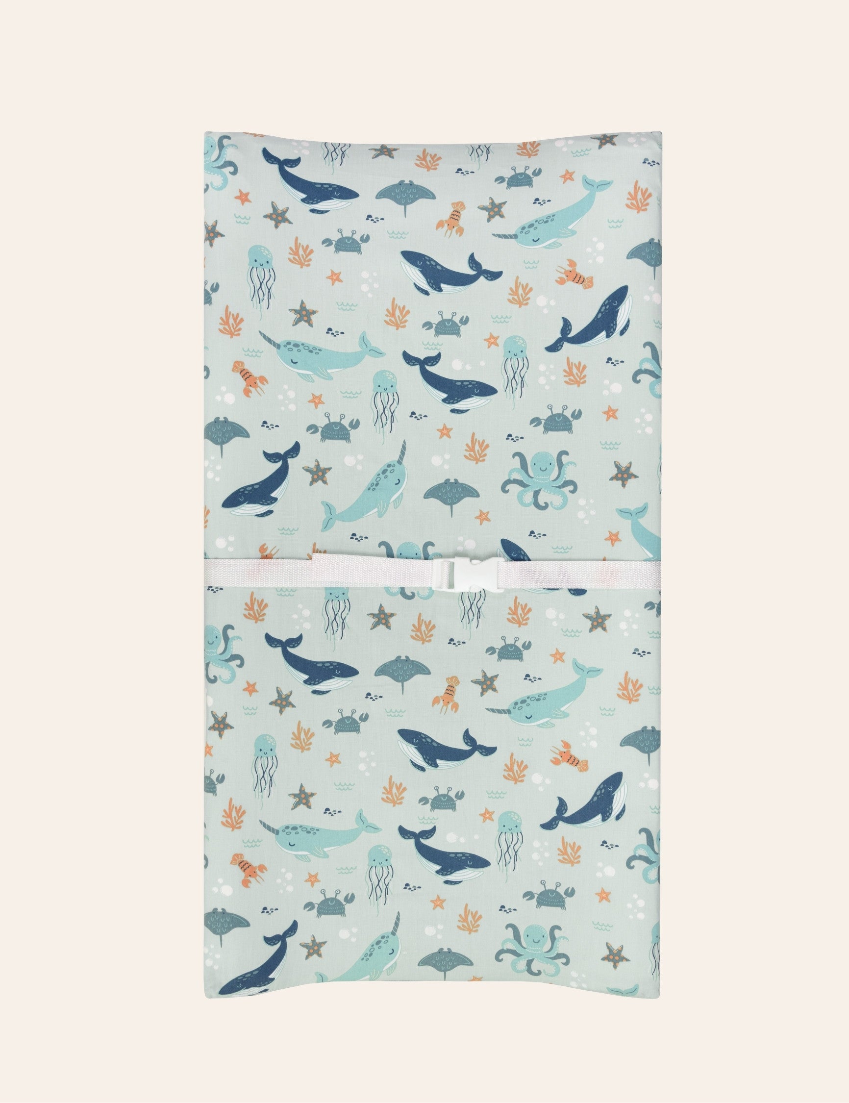 Function: Durable, machine washable, and built to last, this cotton changing pad cover keeps it's soft feel through every wash. Designed to complement any marine nursery decor, these ocean diaper changing pad cover promote airflow and absorb moisture to keep your baby  dry, and comfortable throughout the diaper changes. A must-have in your marine themed baby bedding essentials! Fit all standard 32'x16' small crib matresses and can be safely used as  small baby crib sheets.