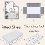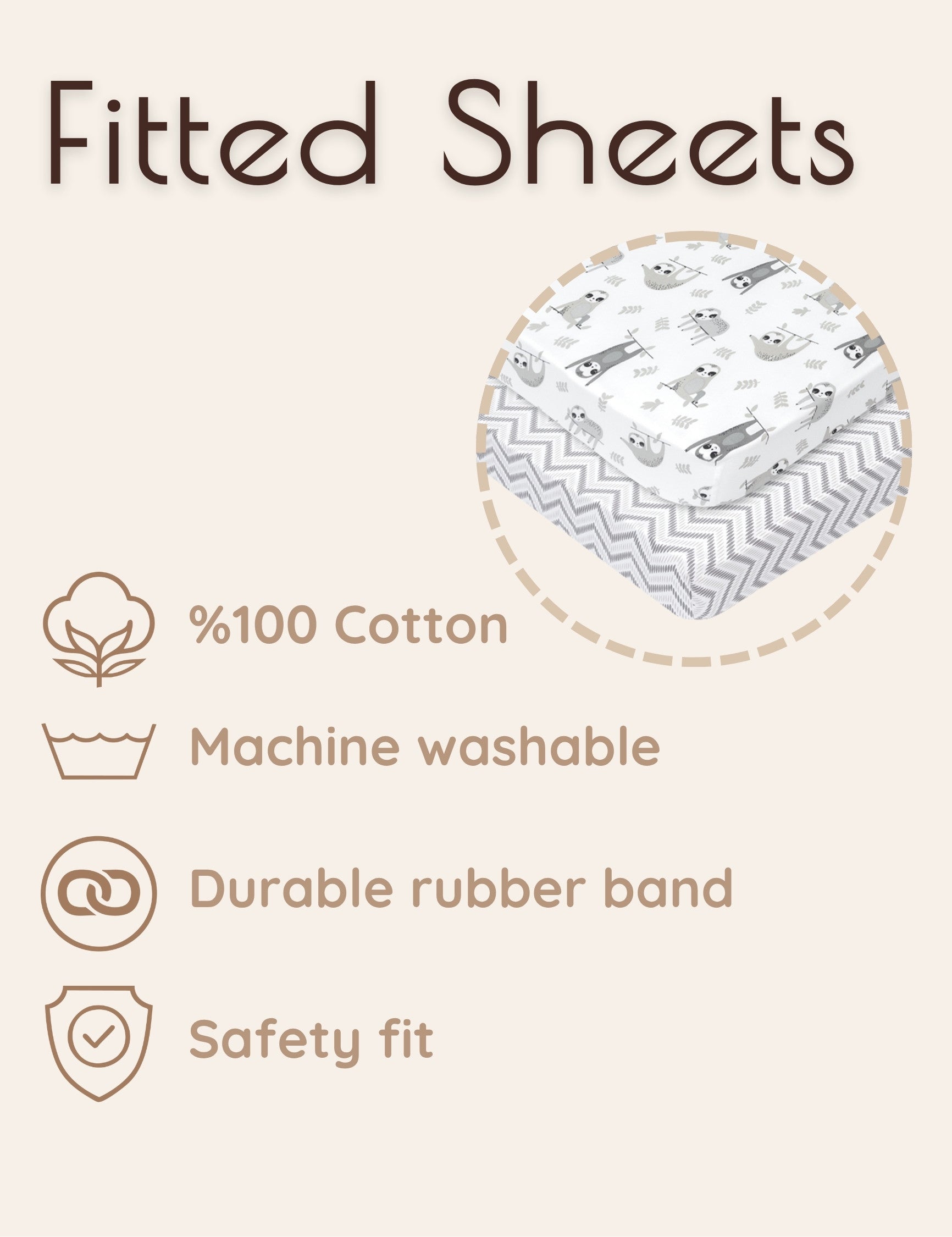 Size:Designed to fit all standard 52x28-inch cribs. These baby bedding sets come in a clear zipper case with a handle and include 5 pieces — 1 sloth and 1 neutral chevron fitted crib sheets (28"x52"), a sloth nursery blanket (42"x33"), a pillowcase (13"x18"), a sloth changing pad cover (22.5"x20.86"), and a crib skirt (13" drop). A perfect addition to your neutral baby bedding items!