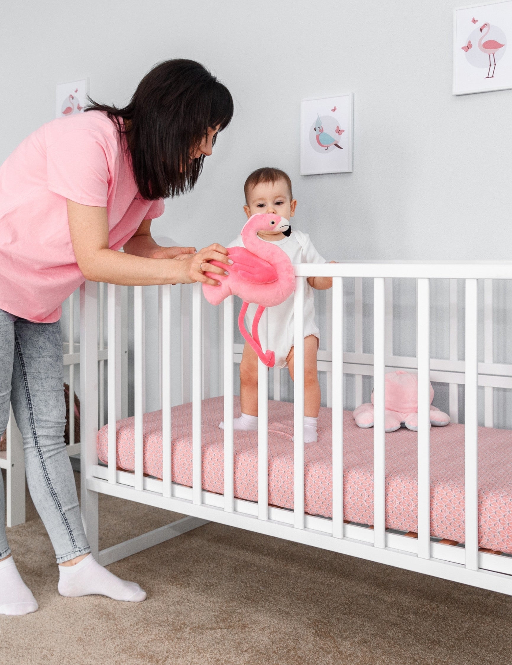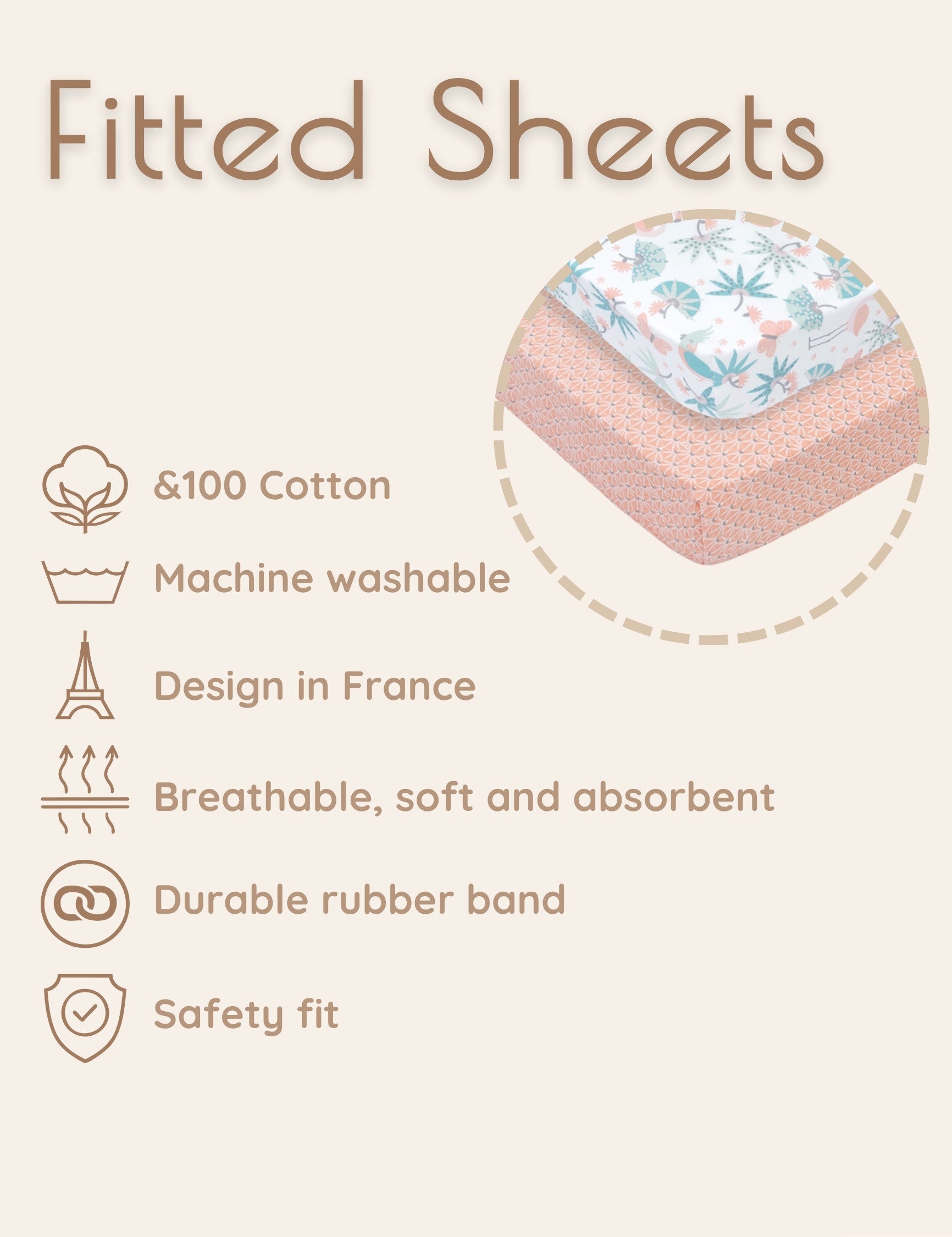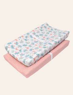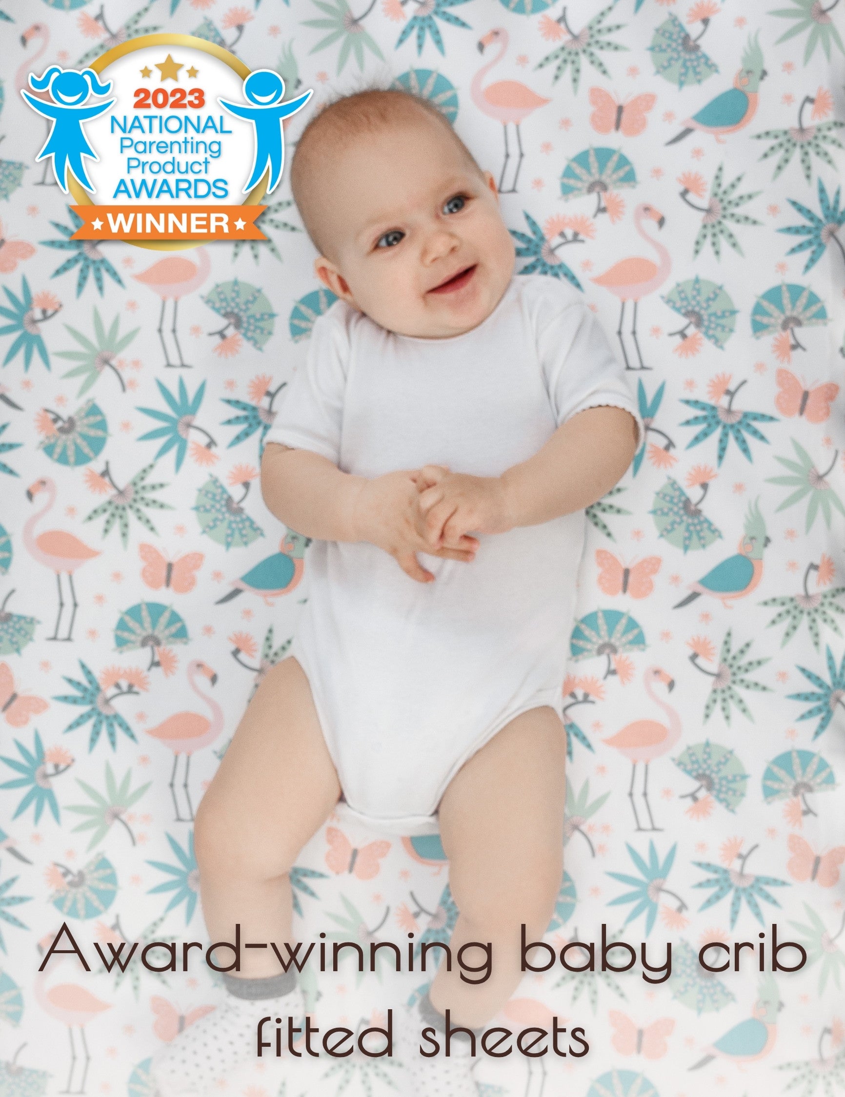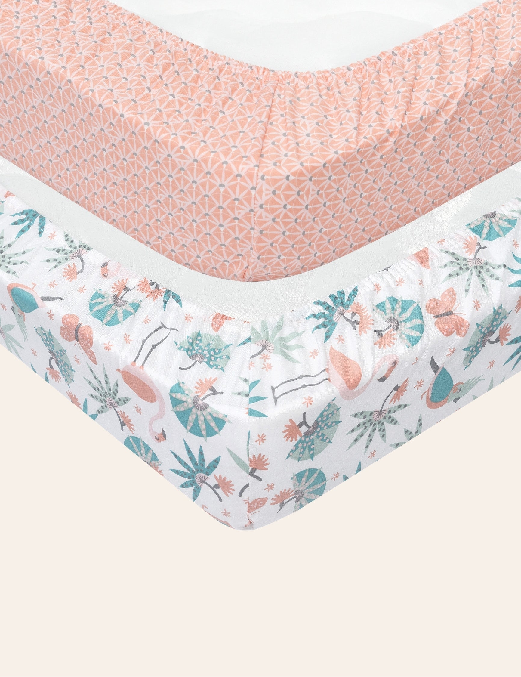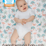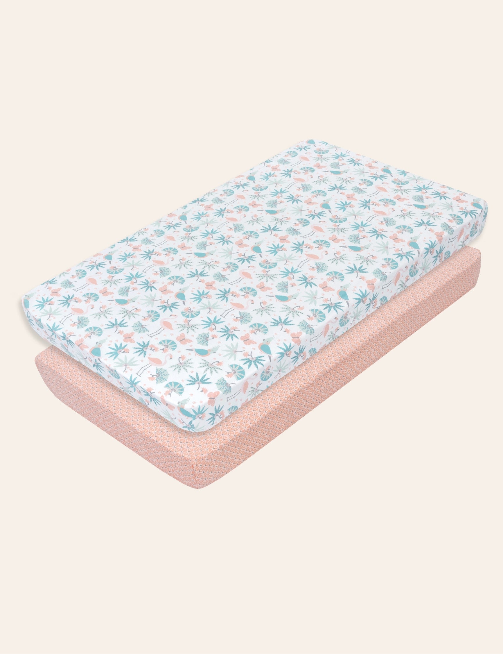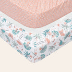 Design: Our jungle leaves fitted crib sheets feature a playful jungle theme with coral pink flmingos, butterflies, blue green forest leaves and parrots. Designed in France, these baby crib sheets are a favorite baby bedding item among parents creating a lively, forest themed nursery. Beautifully packaged and ready to gift, they make a thoughtful choice for baby showers and baby registry must-haves.