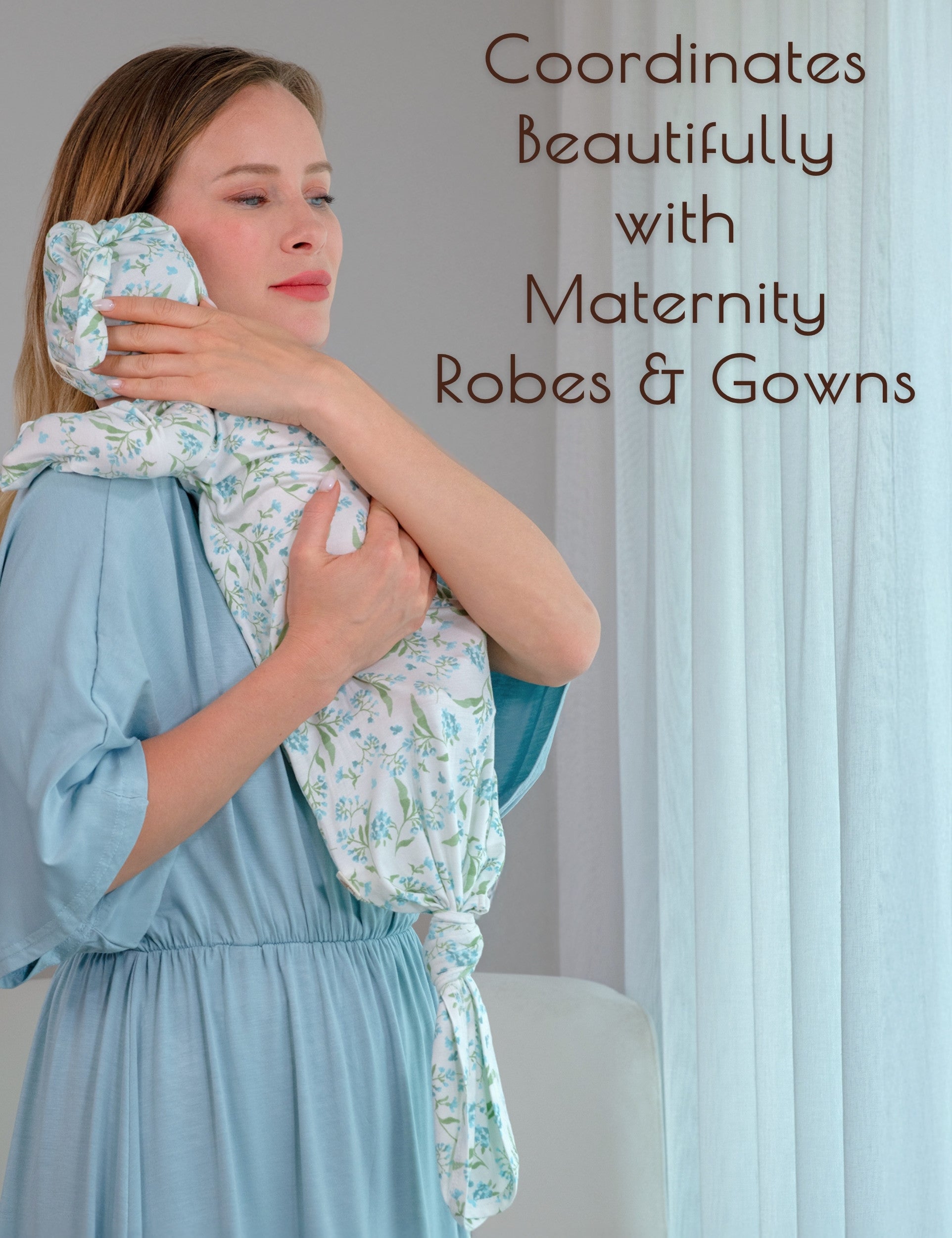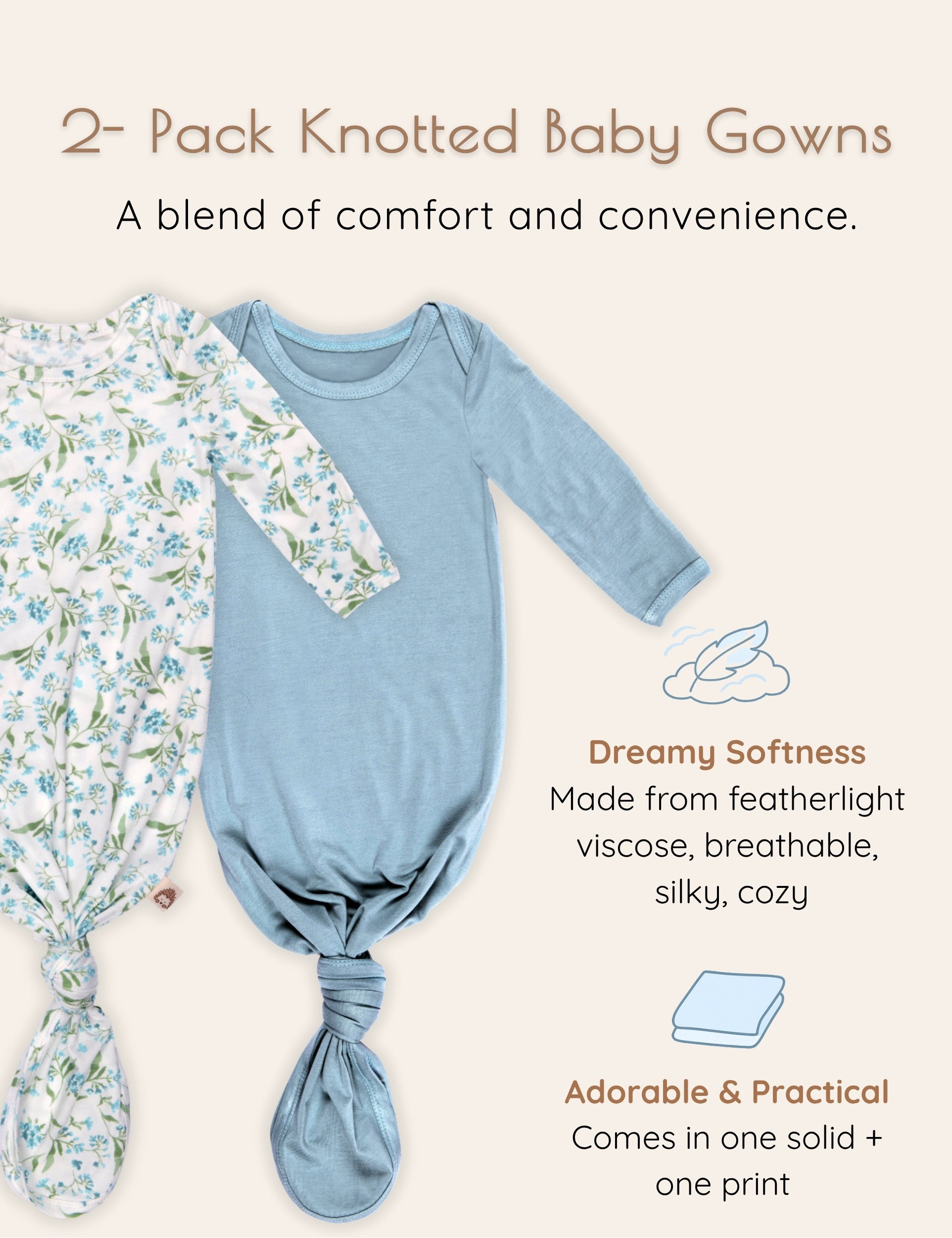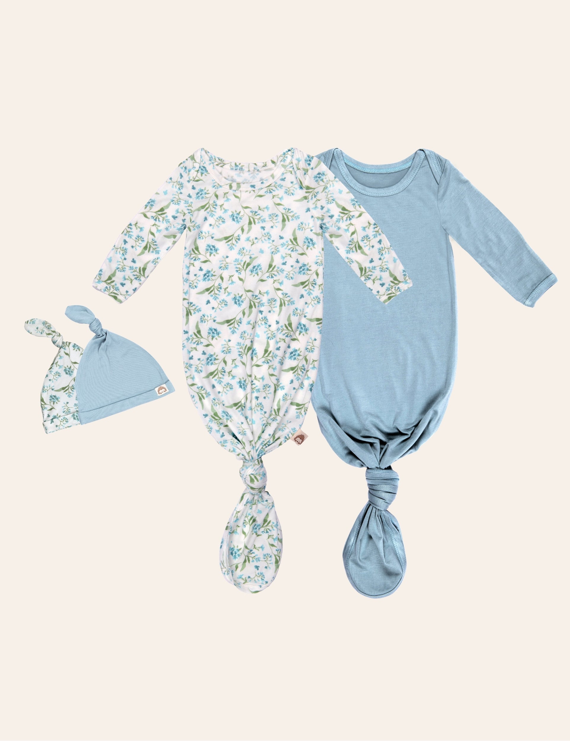 Function: These knotted baby gowns are breathable, stretchy, and ideal for keeping your newborn cozy all day. Our botanical blue knotted newborn gowns feature a knotted bottom that unties easily for fast diaper changes. With no snaps or zippers, knotted newborn gowns are ideal for nighttime changes and everyday use. Whether used as a baby hospital outfit, baby coming home outfit, or for naps at home, the soft fabric allows airflow and gentle movement.