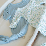 Gender-Neutral Baby Gift: The botanical blue knotted baby gowns are a practical choice as gender-neutral baby shower gifts or baby registry must-haves. Perfect for gifting stylish and functional baby essentials to new parents.