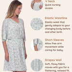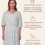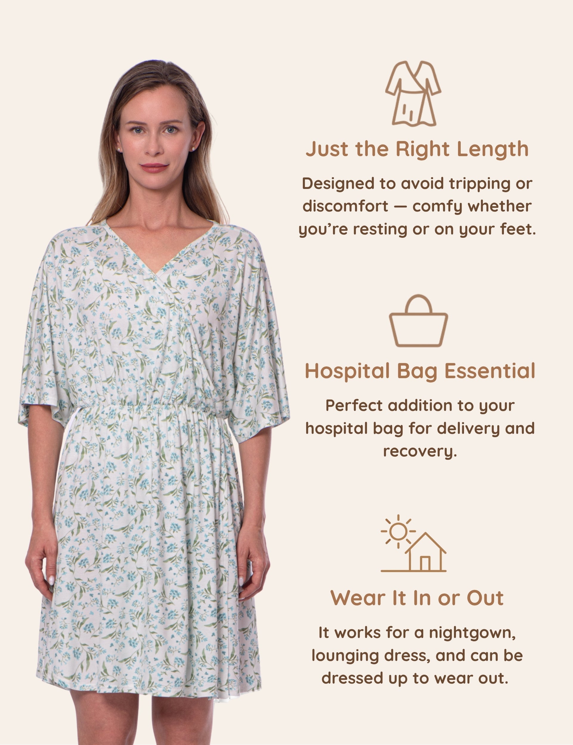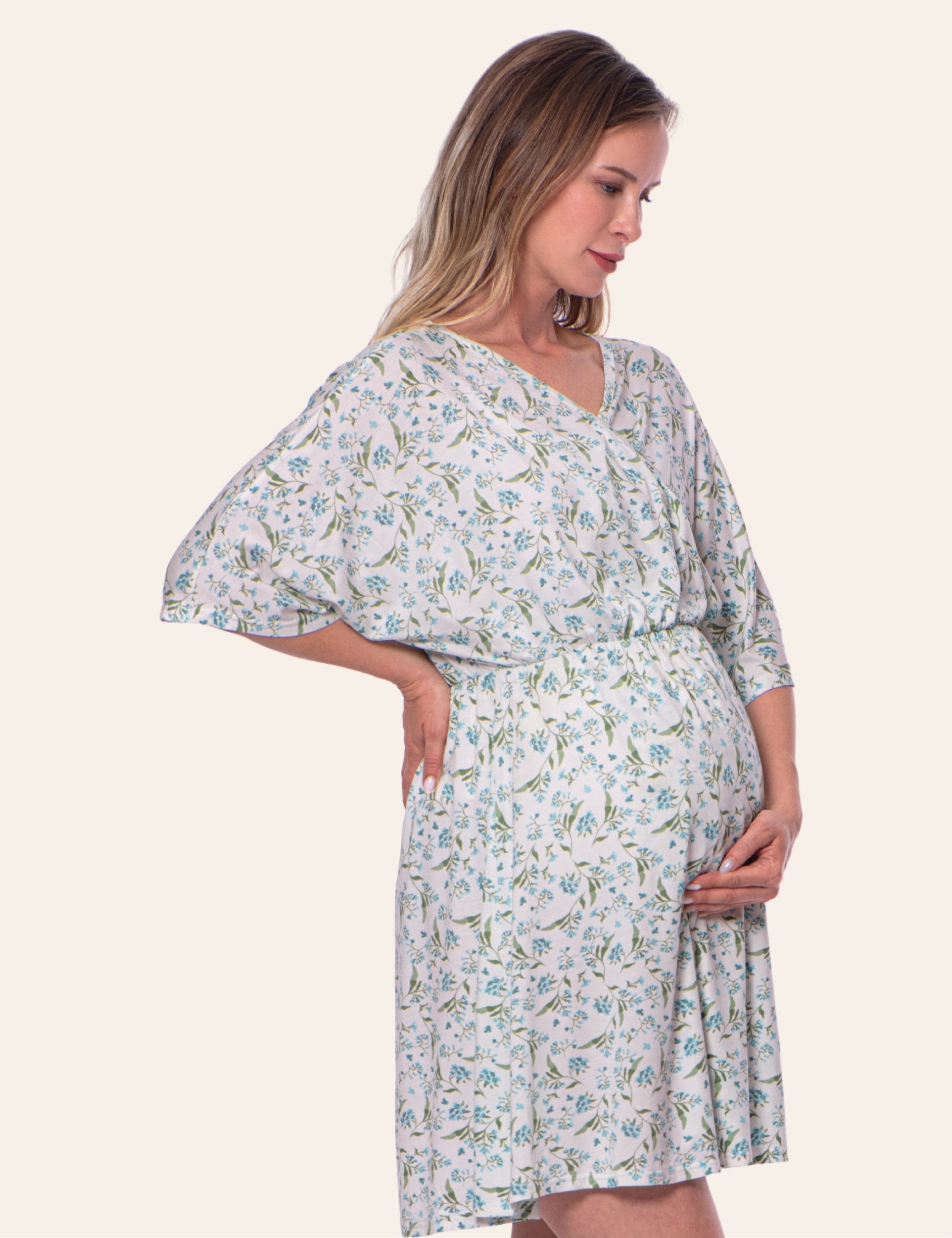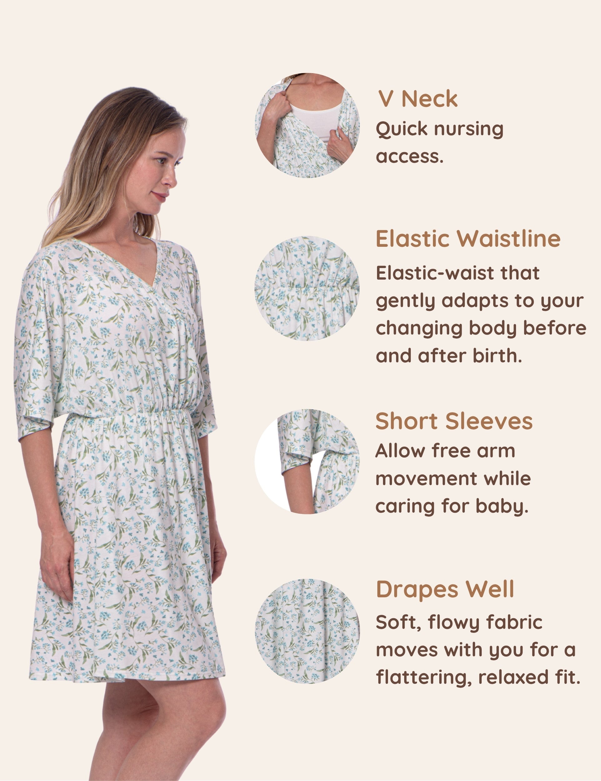 Size: Available in sizes S to 3XL, our nursing dresses are designed to fit and flatter women of all shapes and heights. The elastic waistband of this botanical blue labor and delivery gown stretches effortlessly to support your changing body throughout pregnancy, labor, and postpartum without adding pressure to your belly.