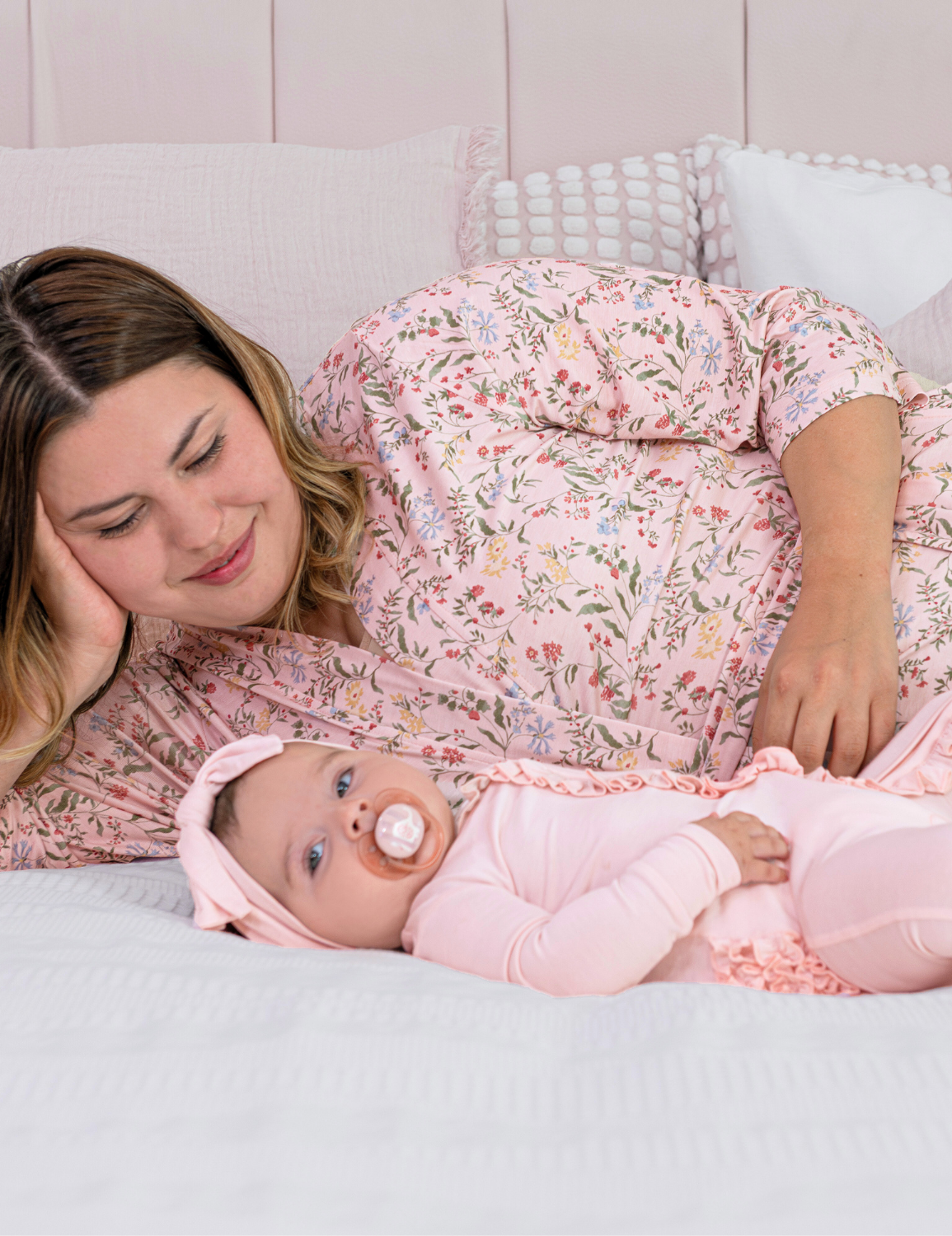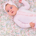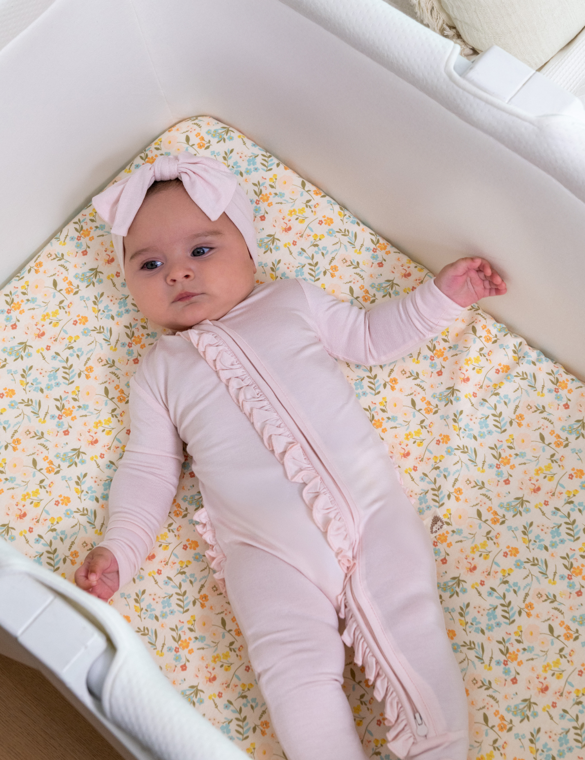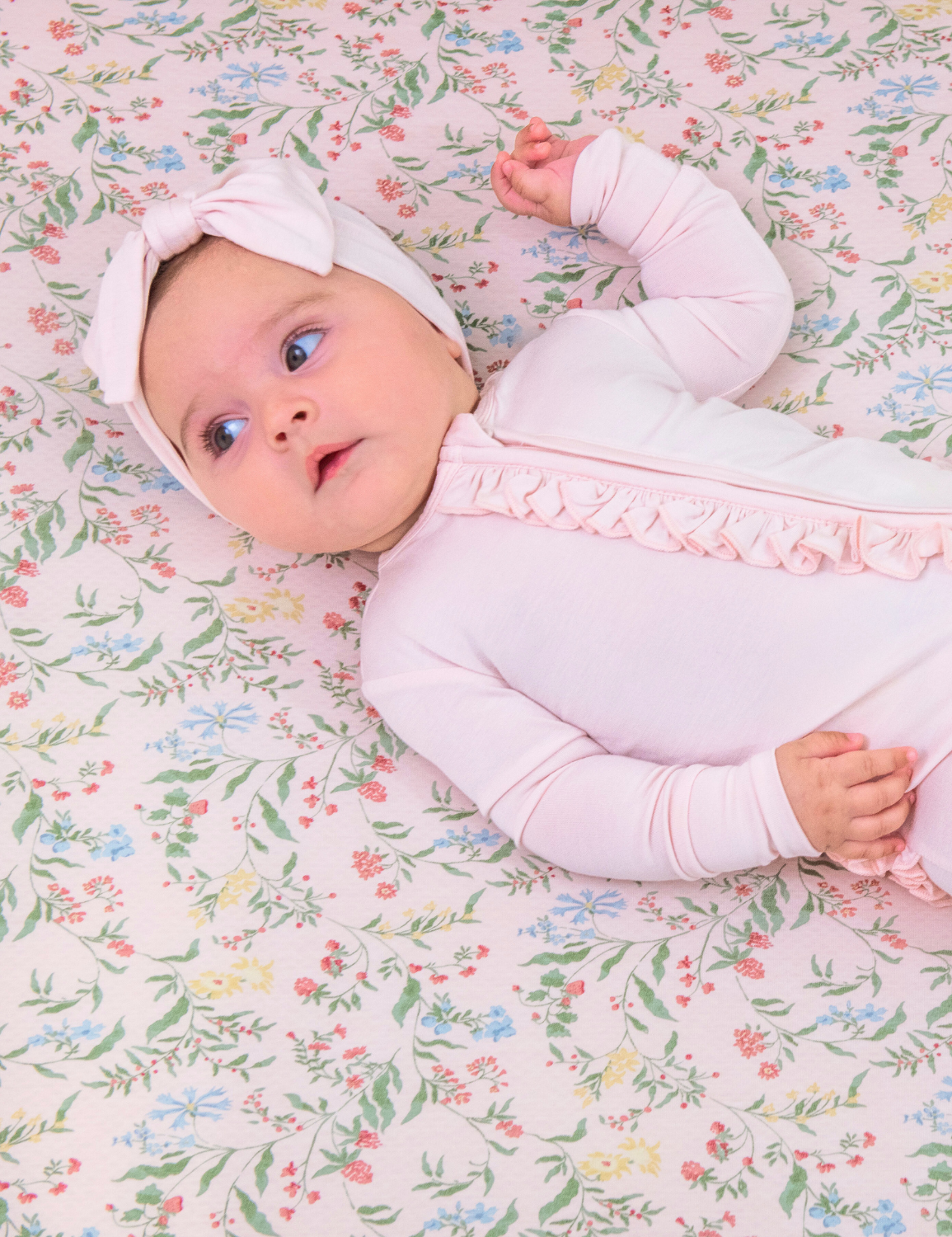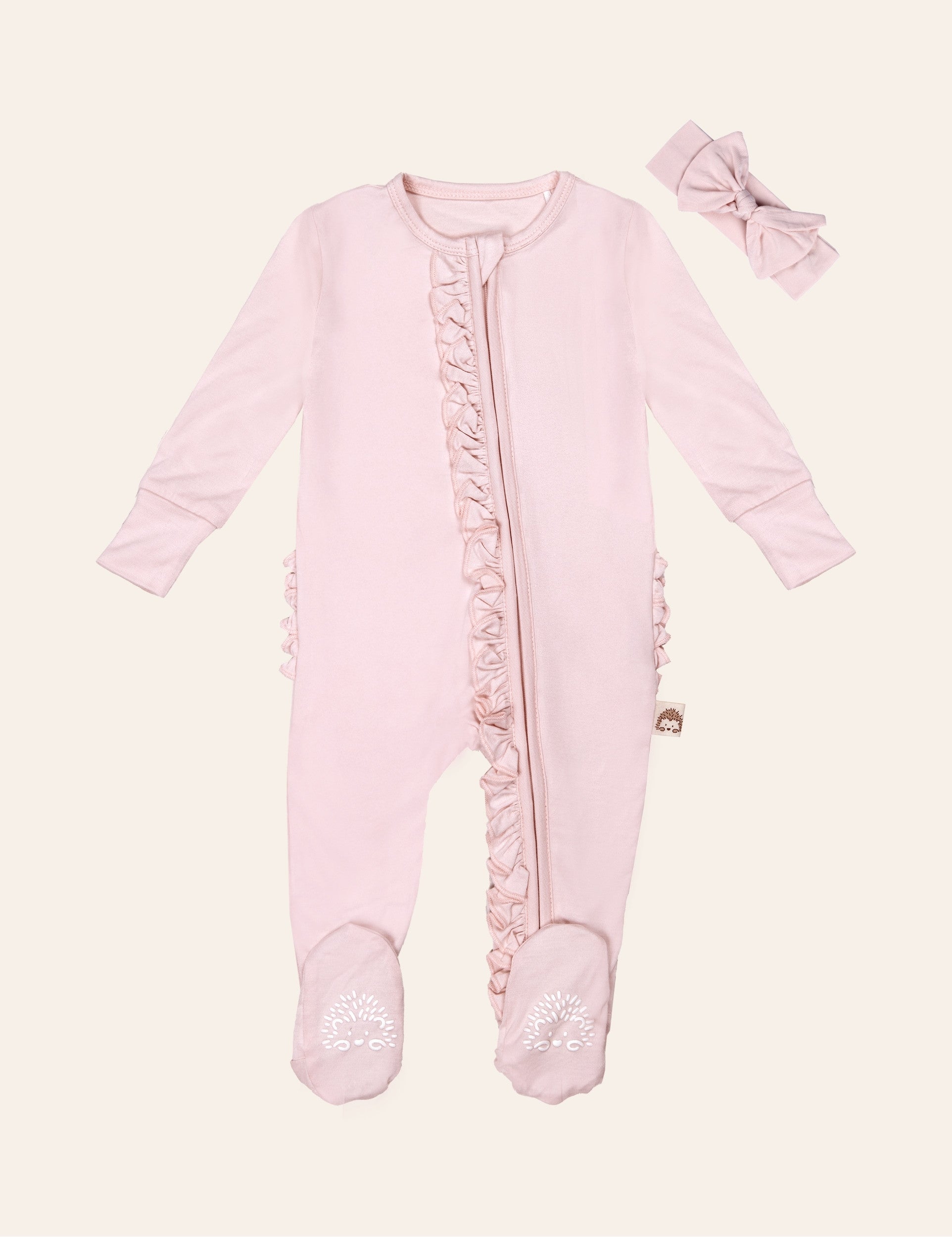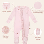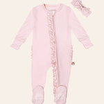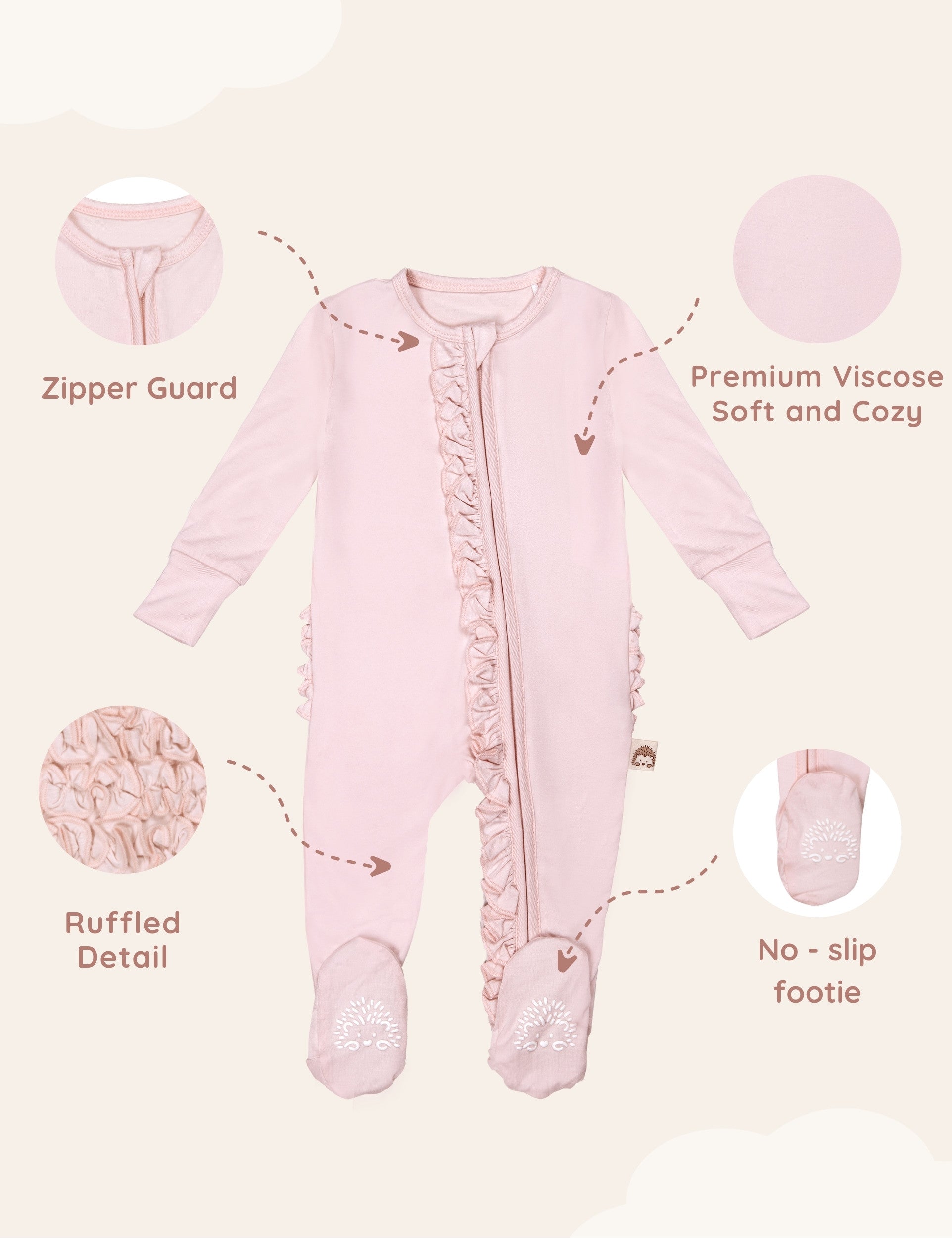 Meet our buttery-soft, pink viscose ruffled baby sleeper!