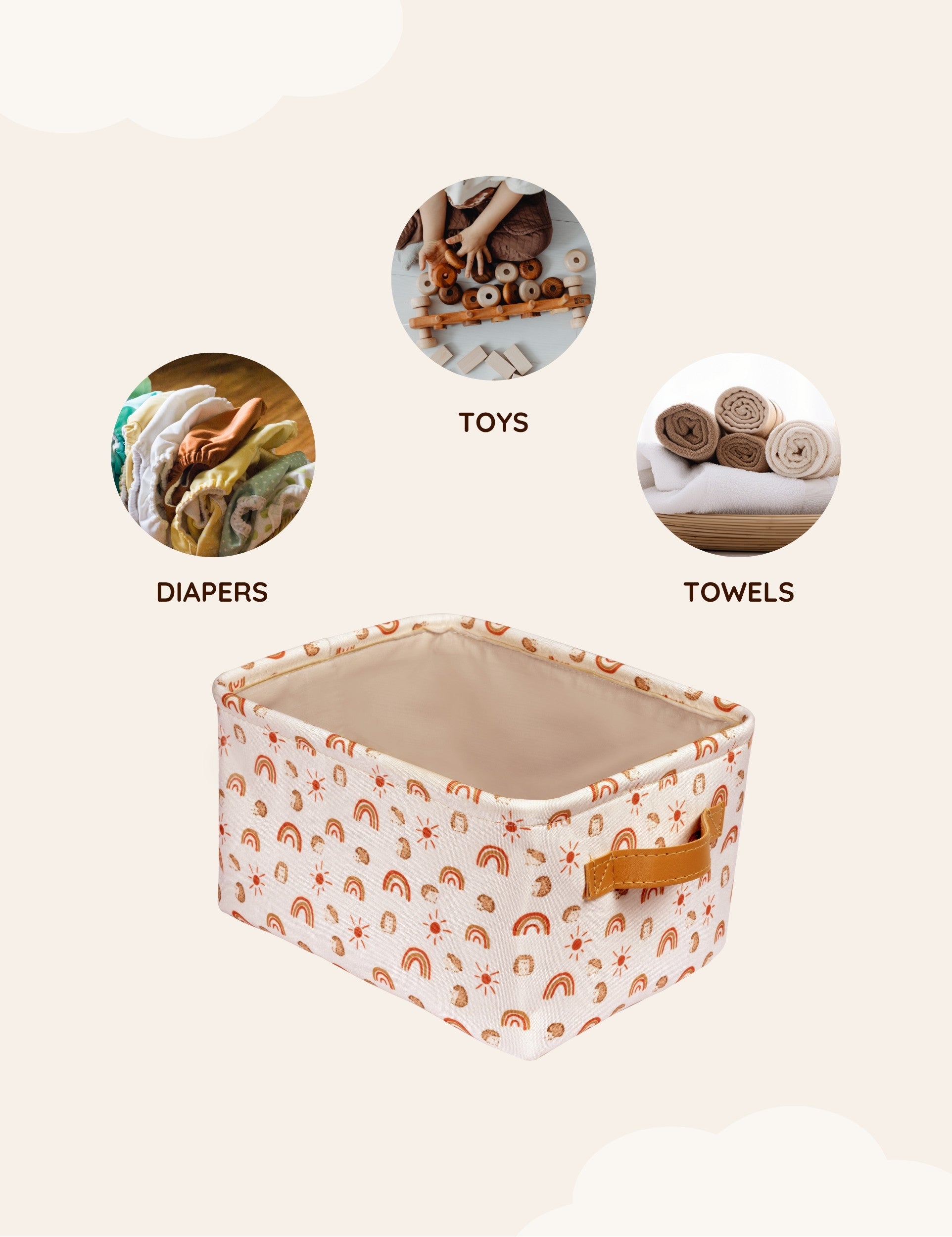 - Kids Storage Bins Material: Our nursery storage bins are crafted from durable canvas fabric with an inner lining, making them easy to clean. Thanks to their light material, this rainbow basket and hedgehog basket with handles are easy to carry.