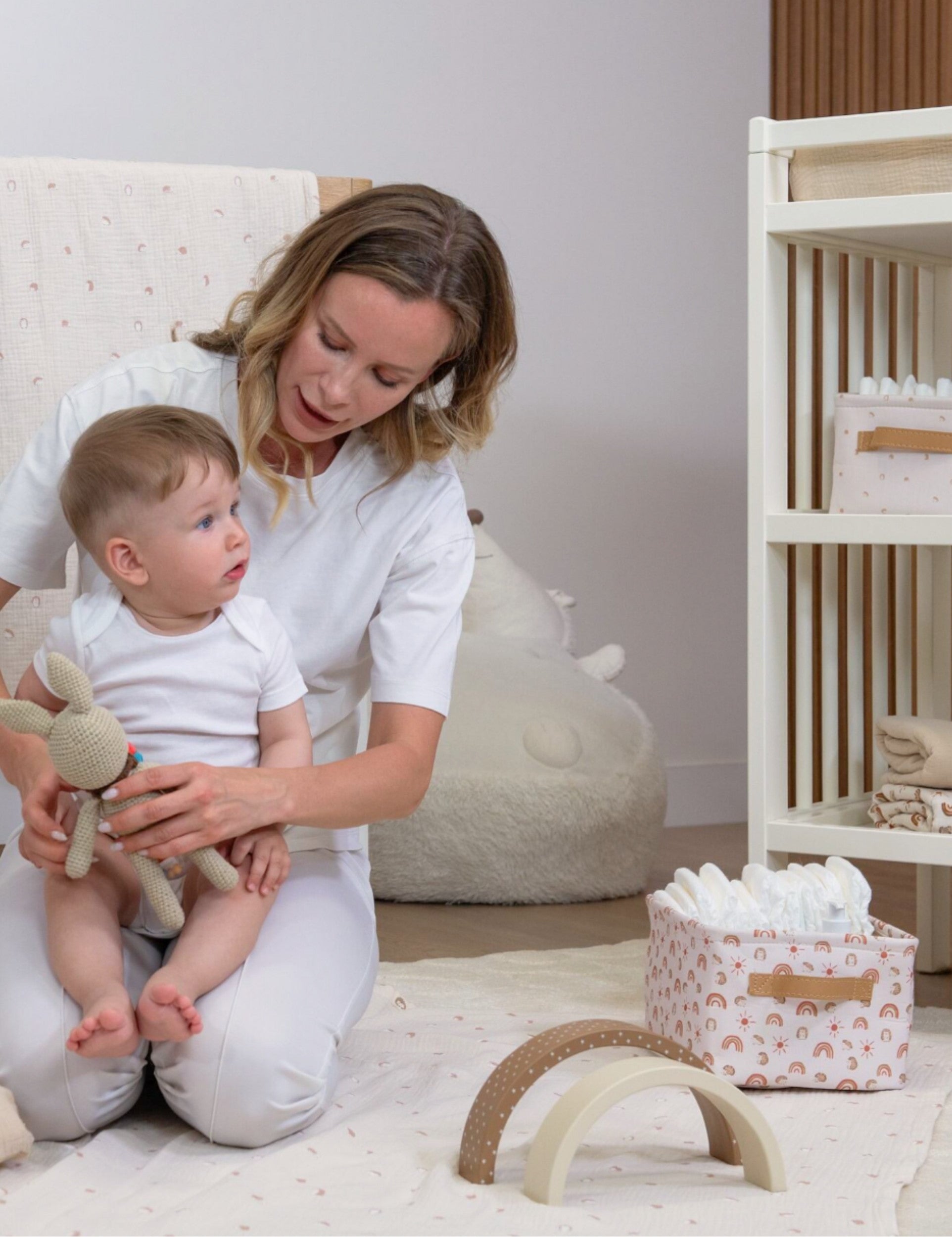- Designed in France: Kids storage bins for nursery include one rainbow basket and one basket with hedgehog pattern. Thanks to their on-trend style, our baby hamper for nursery can be used on their own or to complement neutral, rainbow nursery decorations. These kids storage bins perfectly match My Little Zone's rainbow items such as rainbow muslin blankets, changing pad covers, rainbow crib fitted sheets, and more.