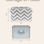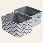 Material: My Little Zone canvas storage bins are made from sturdy canvas with a soft inner lining with leather side handles and offer both durability and comfort. These grey chevron nursery storage bins bring a clean, charming touch to any modern nursery.