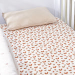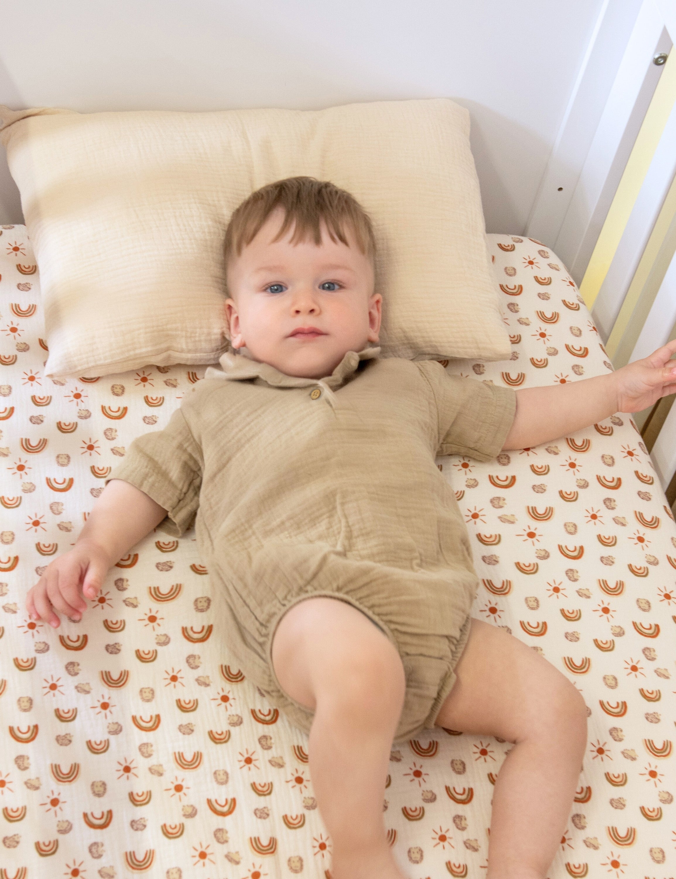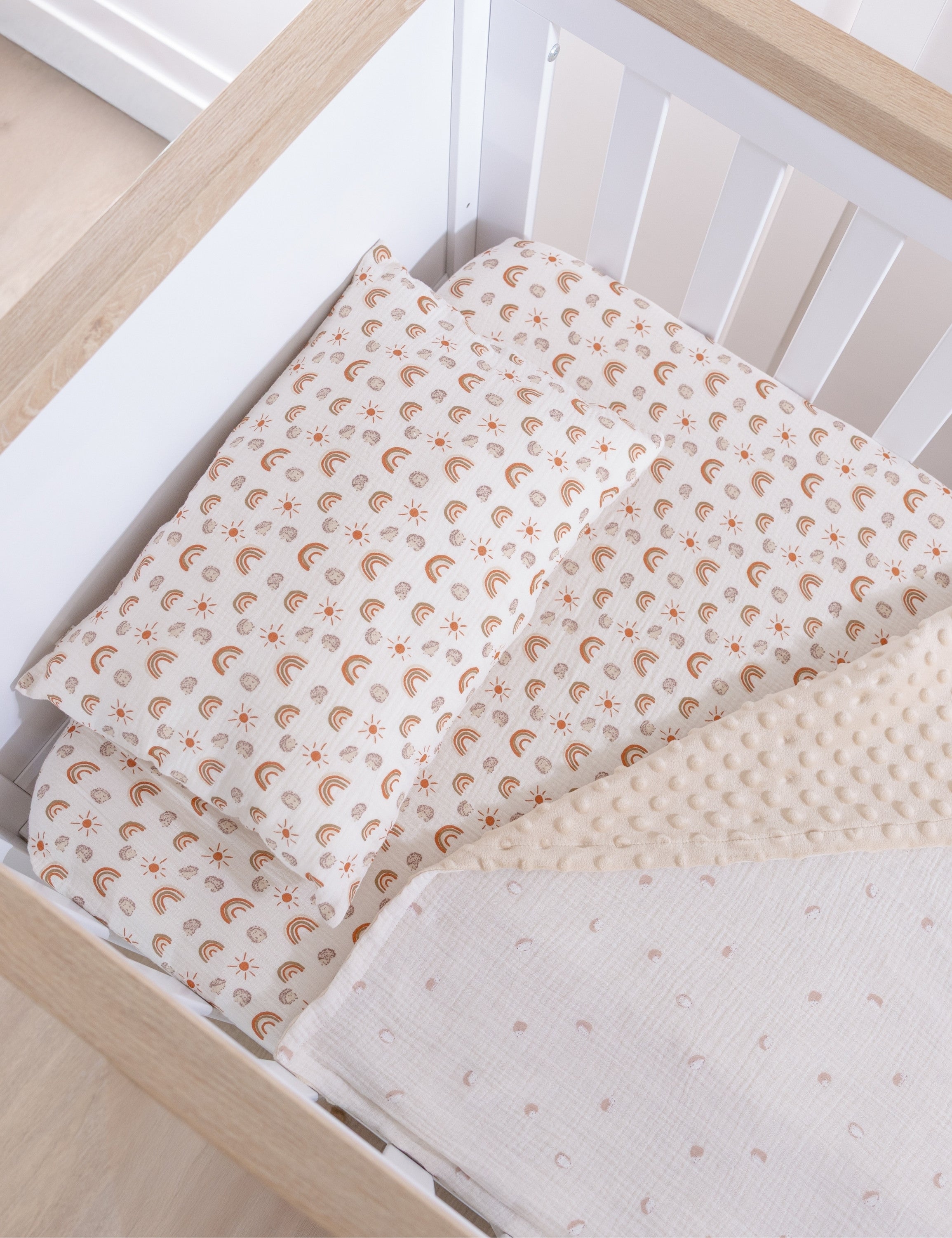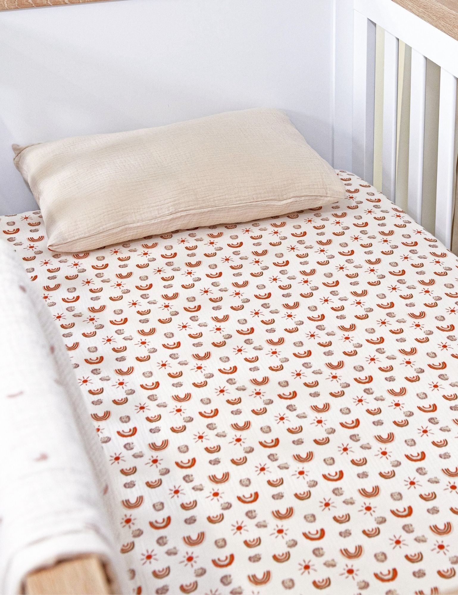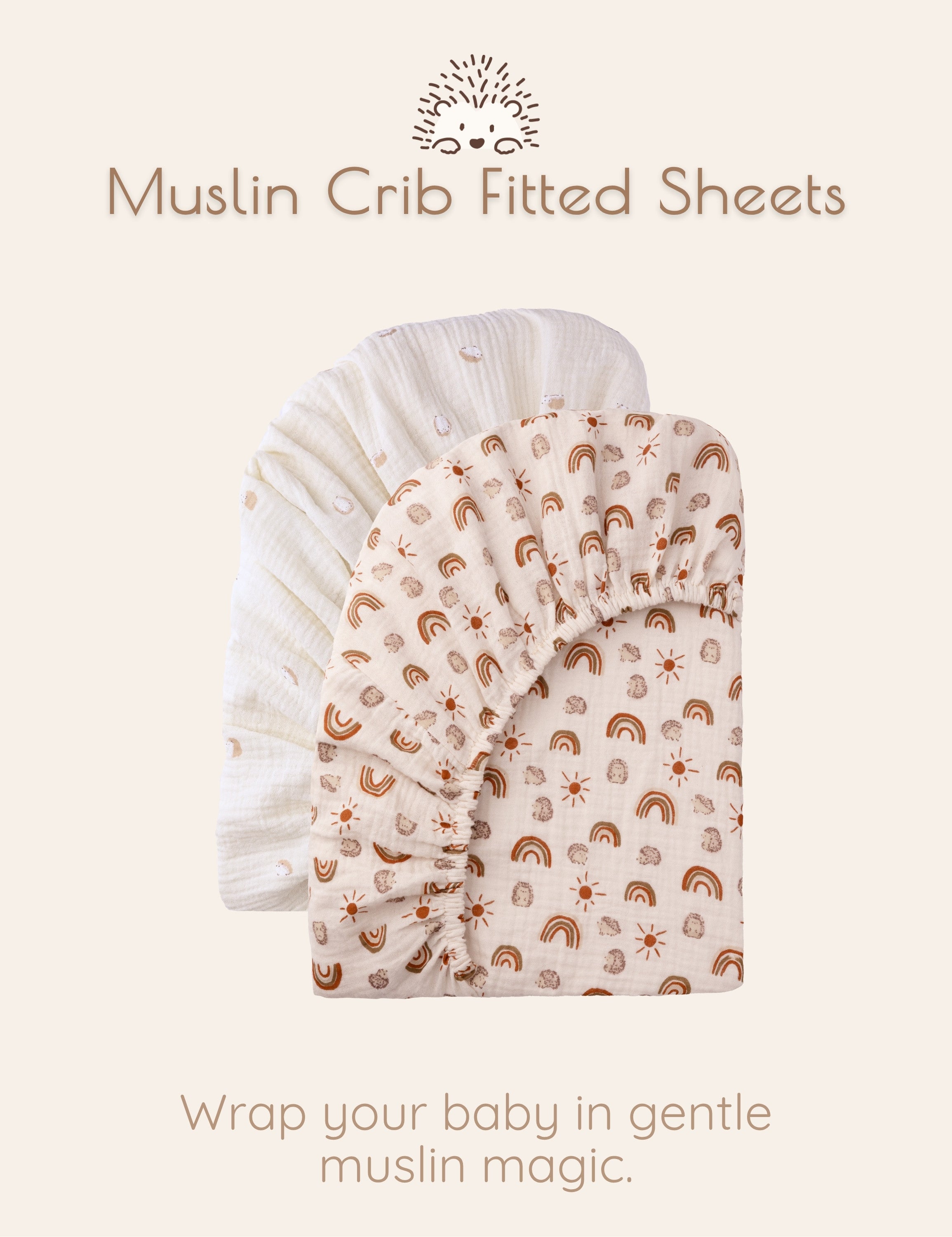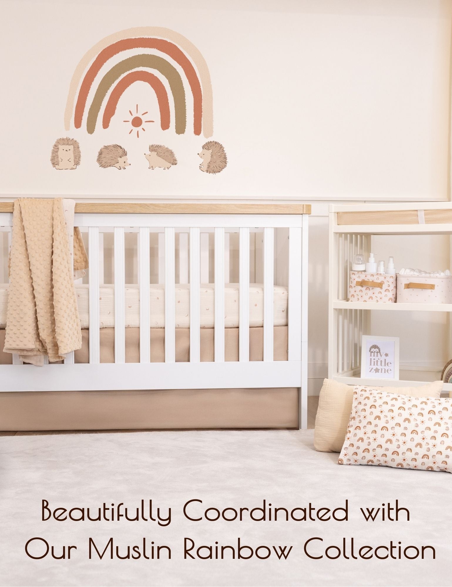 Meet our cheerful rainbow muslin crib sheets made for gentle nursery comfort.