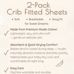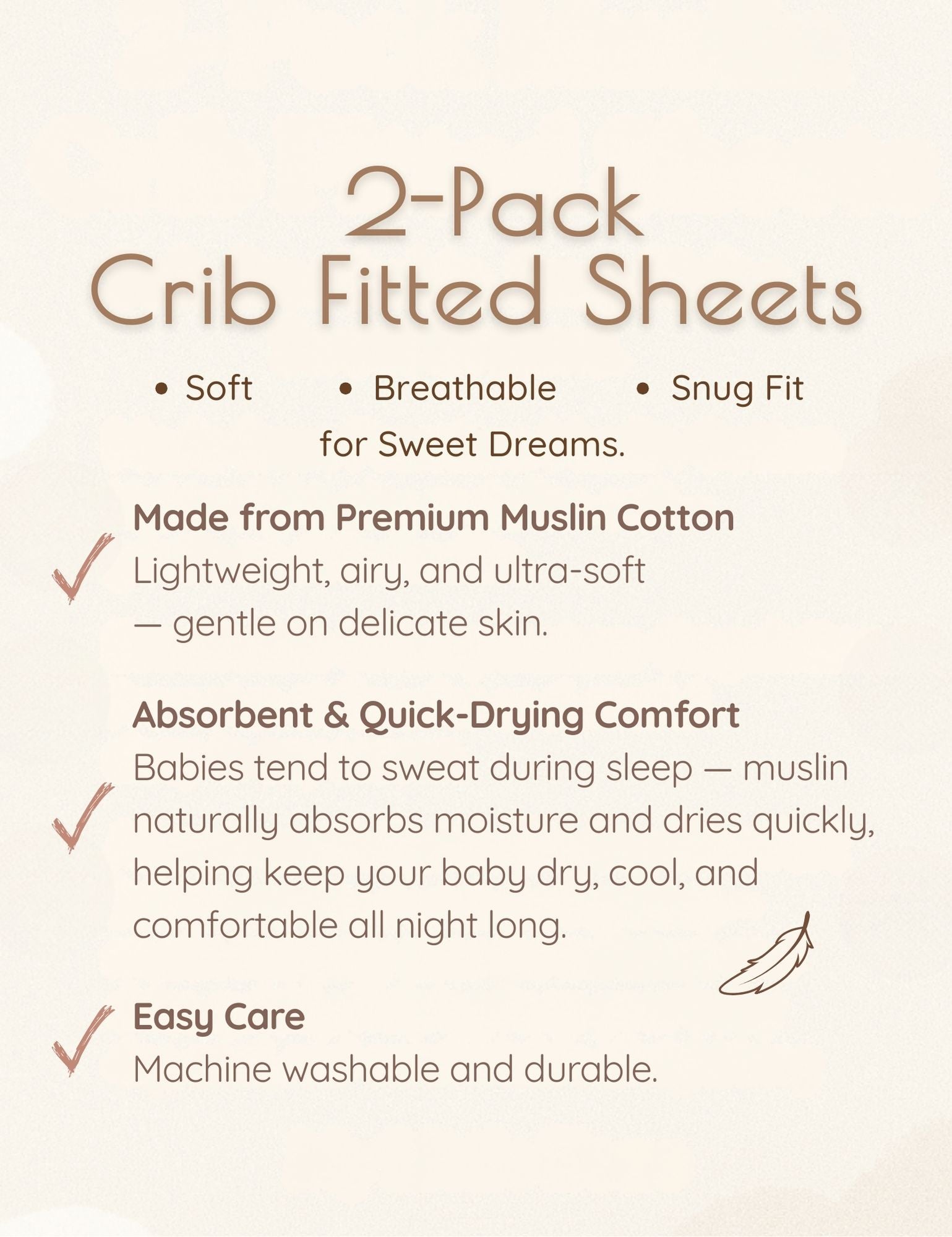 Material: 100% Muslin Cotton. These muslin crib sheets are crafted from lightweight, breathable, OEKO-TEX® certified cotton for everyday comfort and skin safety. The natural, airy texture makes these baby crib sheets ideal for delicate baby skin.