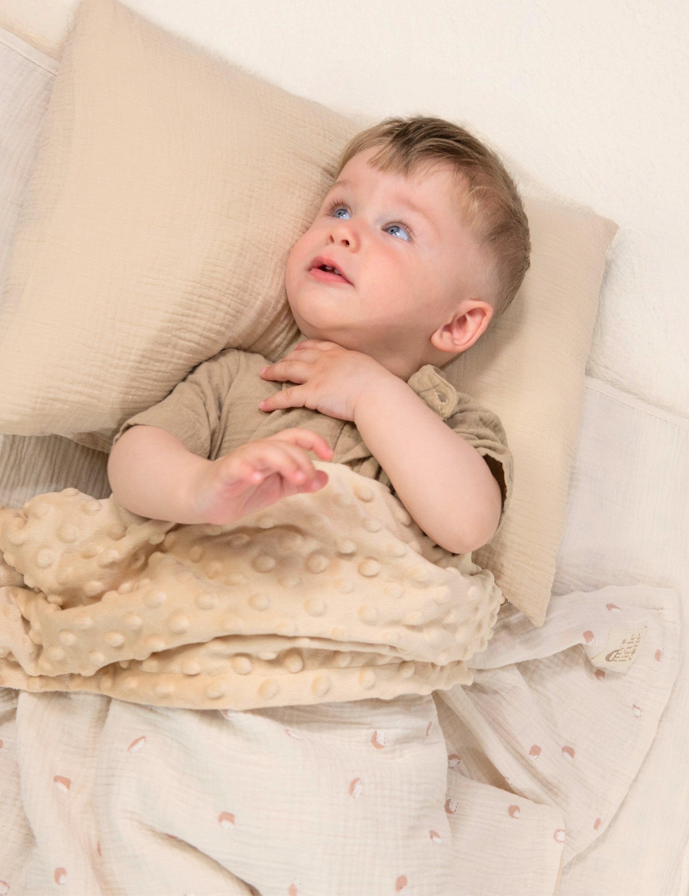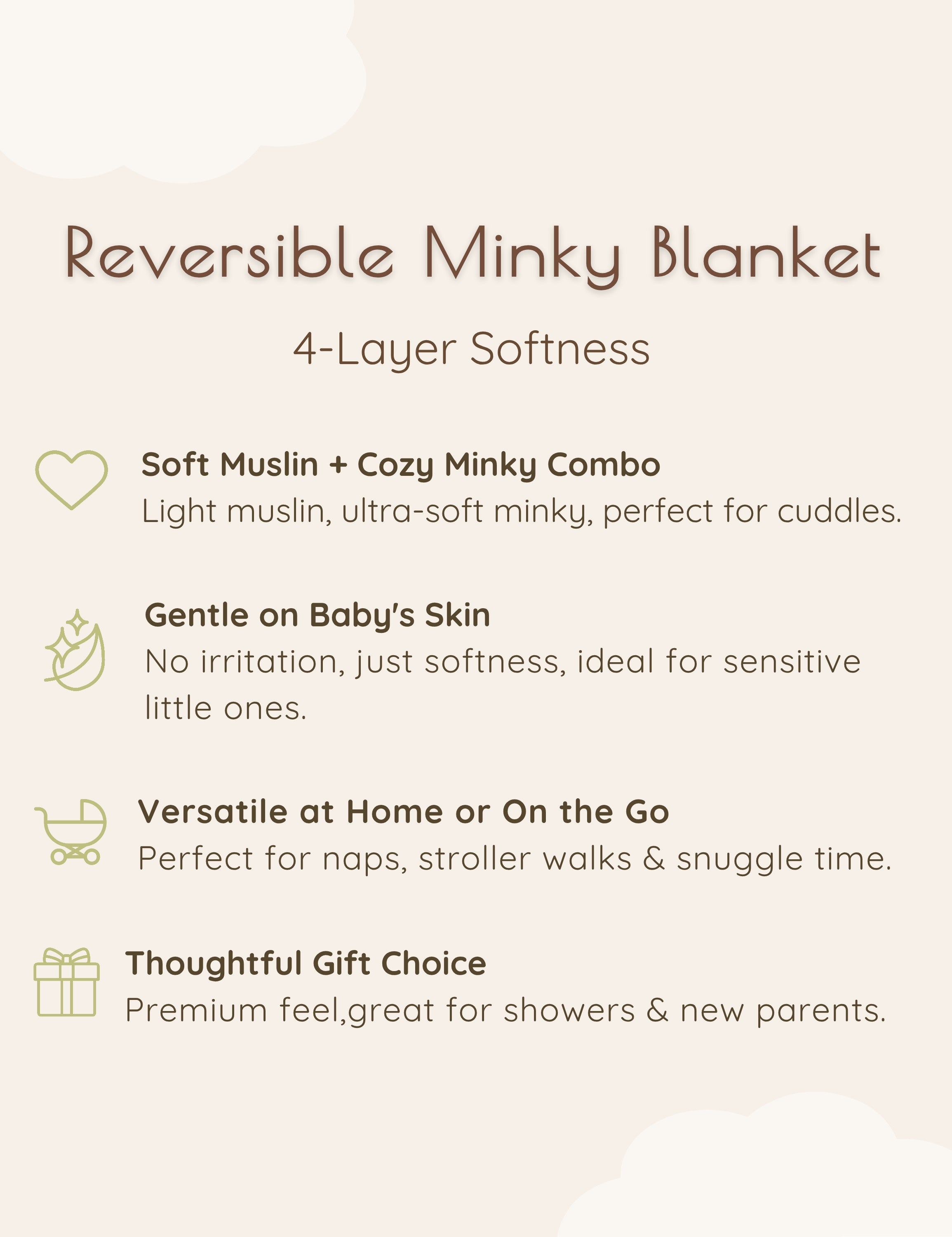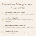 Material: Featuring a plush minky side paired with a breathable 100% Muslin Cotton layer, this muslin baby blanket is soft, cozy, and OEKO-TEX® certified for everyday comfort and skin safety. The gentle, natural texture makes this neutral minky infant blanket ideal for delicate baby skin.