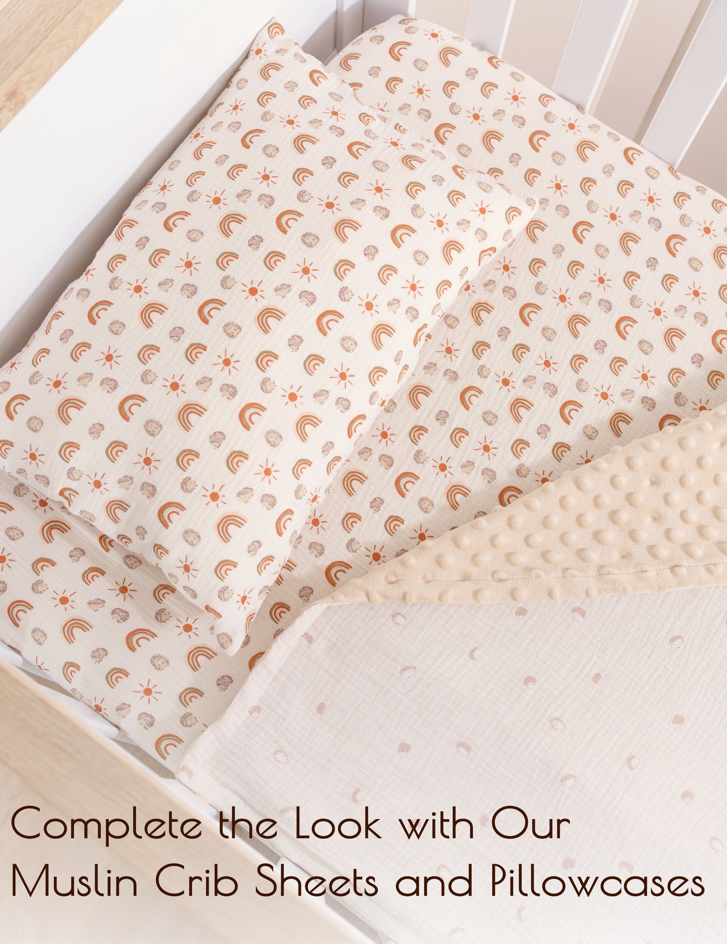Design: Designed in France, the Rainbow Collection Minky Blanket blends a cheerful rainbow print on the muslin side with a luxuriously soft creamy beige minky backing for a modern, neutral baby blanket look. This rainbow muslin blanket style pairs beautifully with baby clothes, baby bedding, and nursery decor as part of your everyday baby essentials collection.