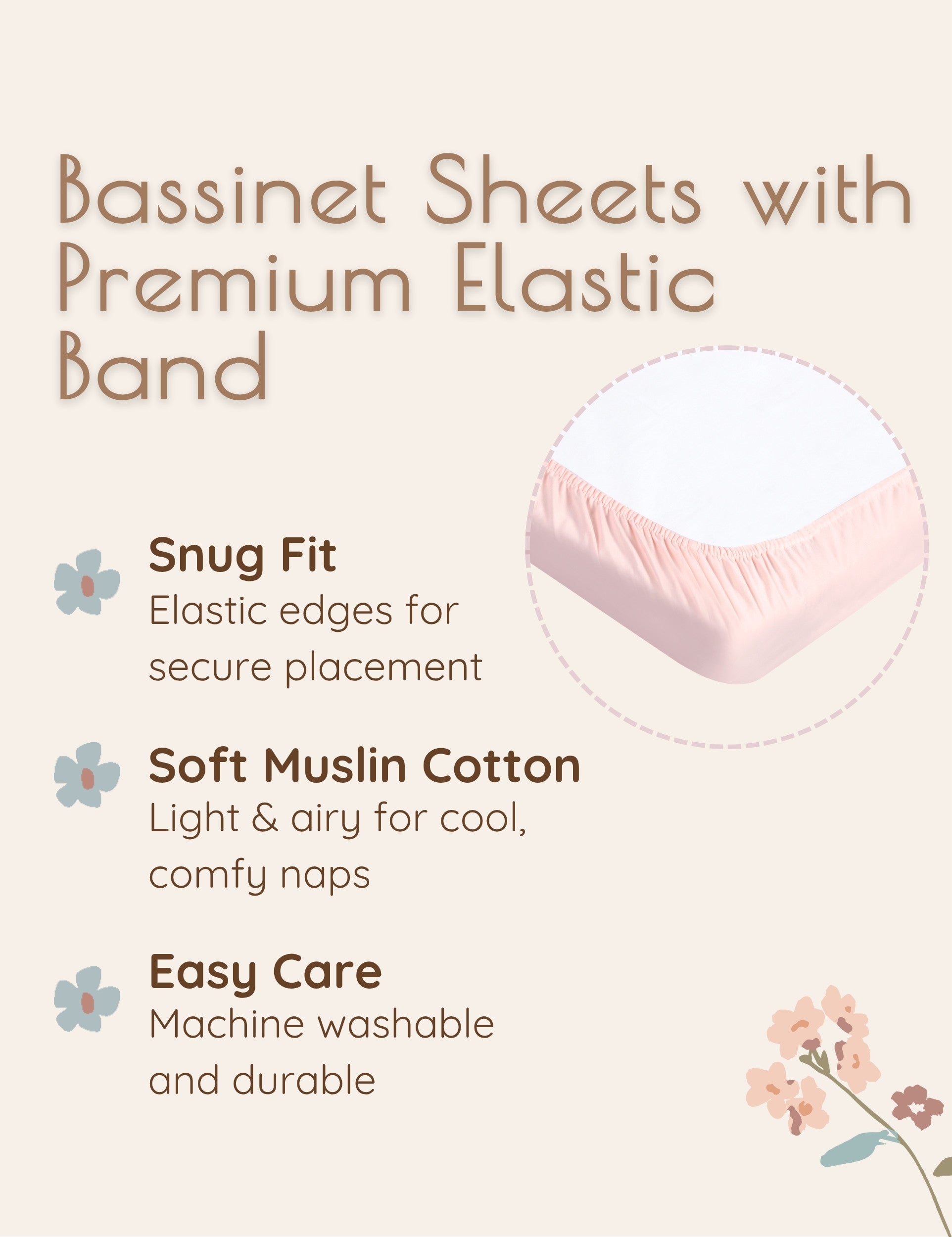 Features: These bassinet fitted sheets feature premium elastic with extra stretch all the way around, ensuring a safe, secure, stay-in-place fit.