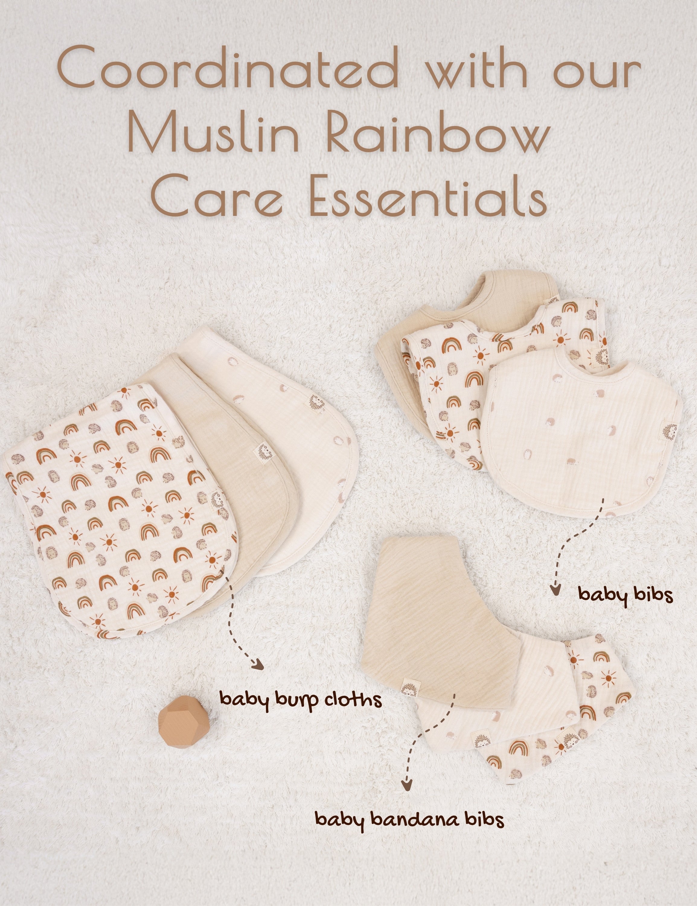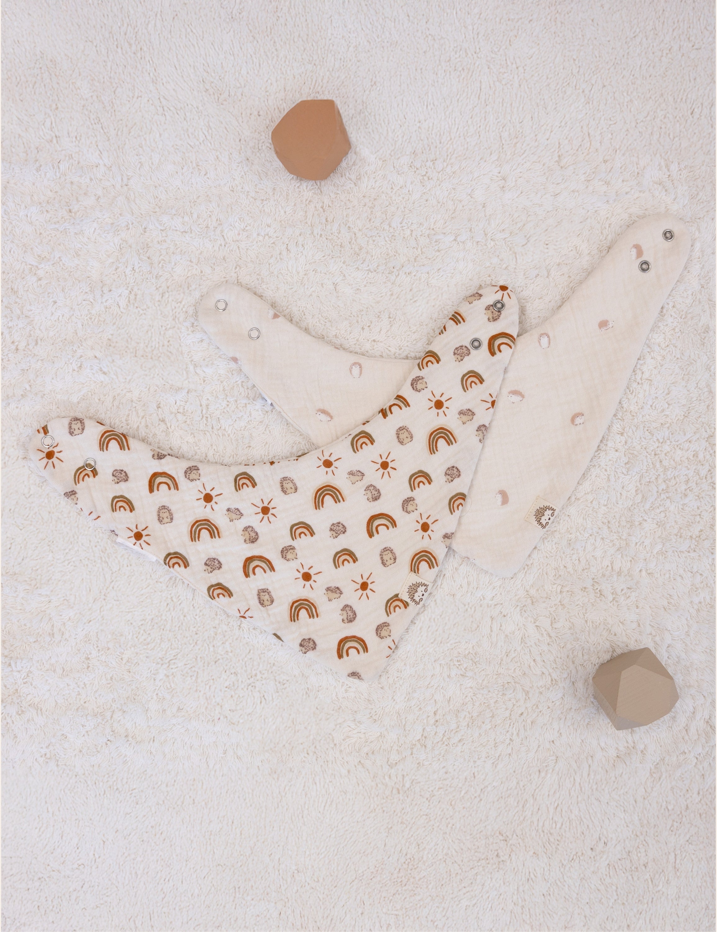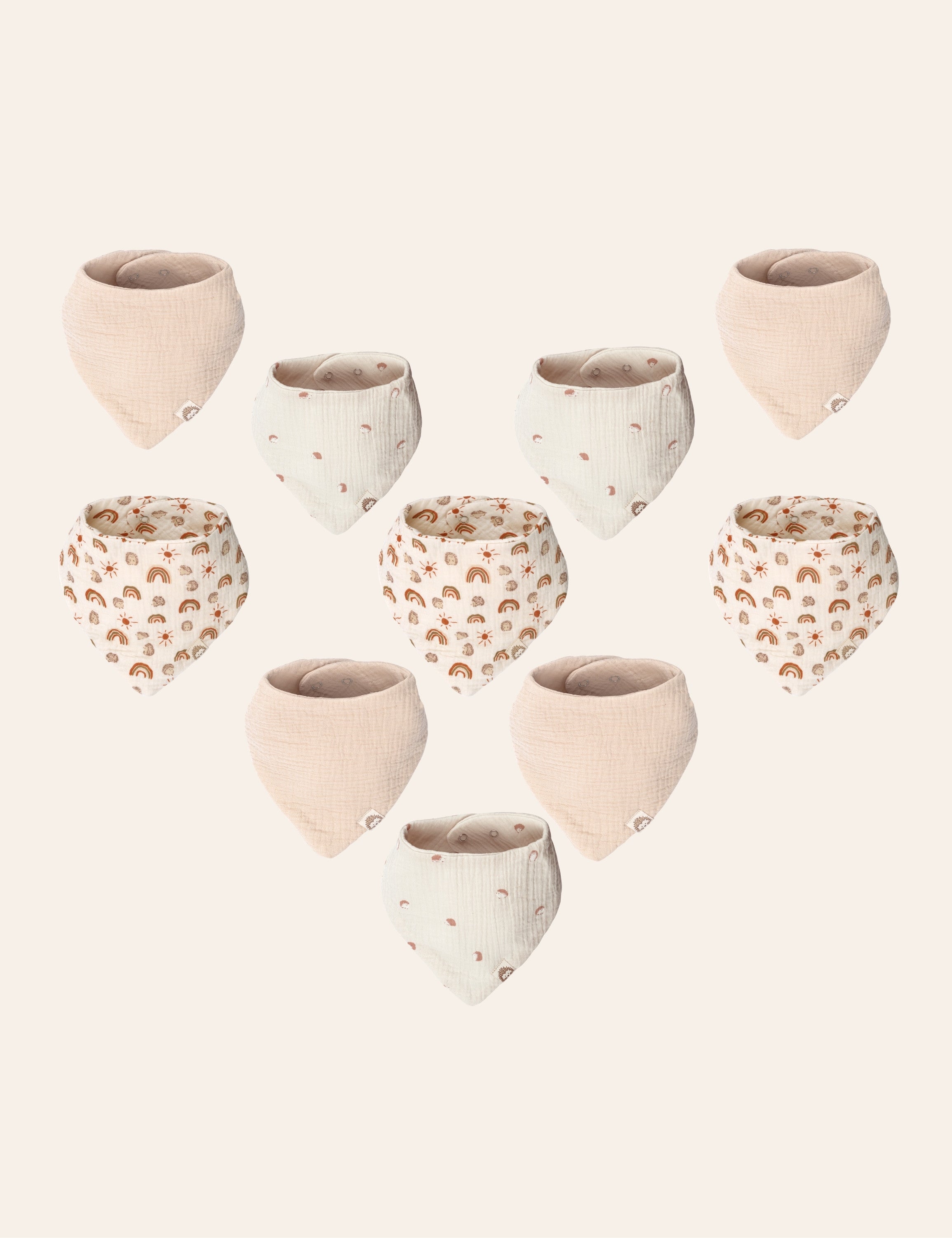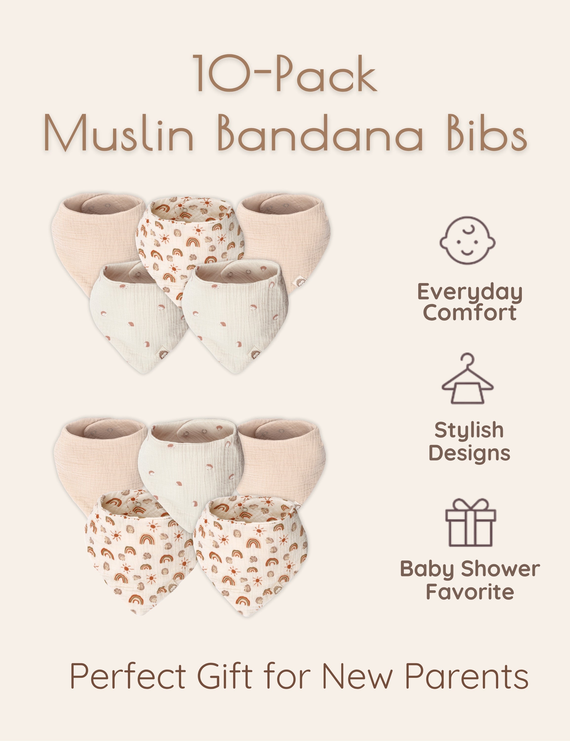 • French Design Drool Bibs for Baby Boy or Girl: Created by a talented French designer, these muslin baby bibs for eating are as stylish as they are practical. The 10-piece muslin bibs boy or girl set includes three rainbow muslin bibs, three hedgehog animal print bibs, four neutral bandana bibs for baby boy or girl. These are the perfect gender-neutral baby bibs with rainbow patterns and neutral colors.