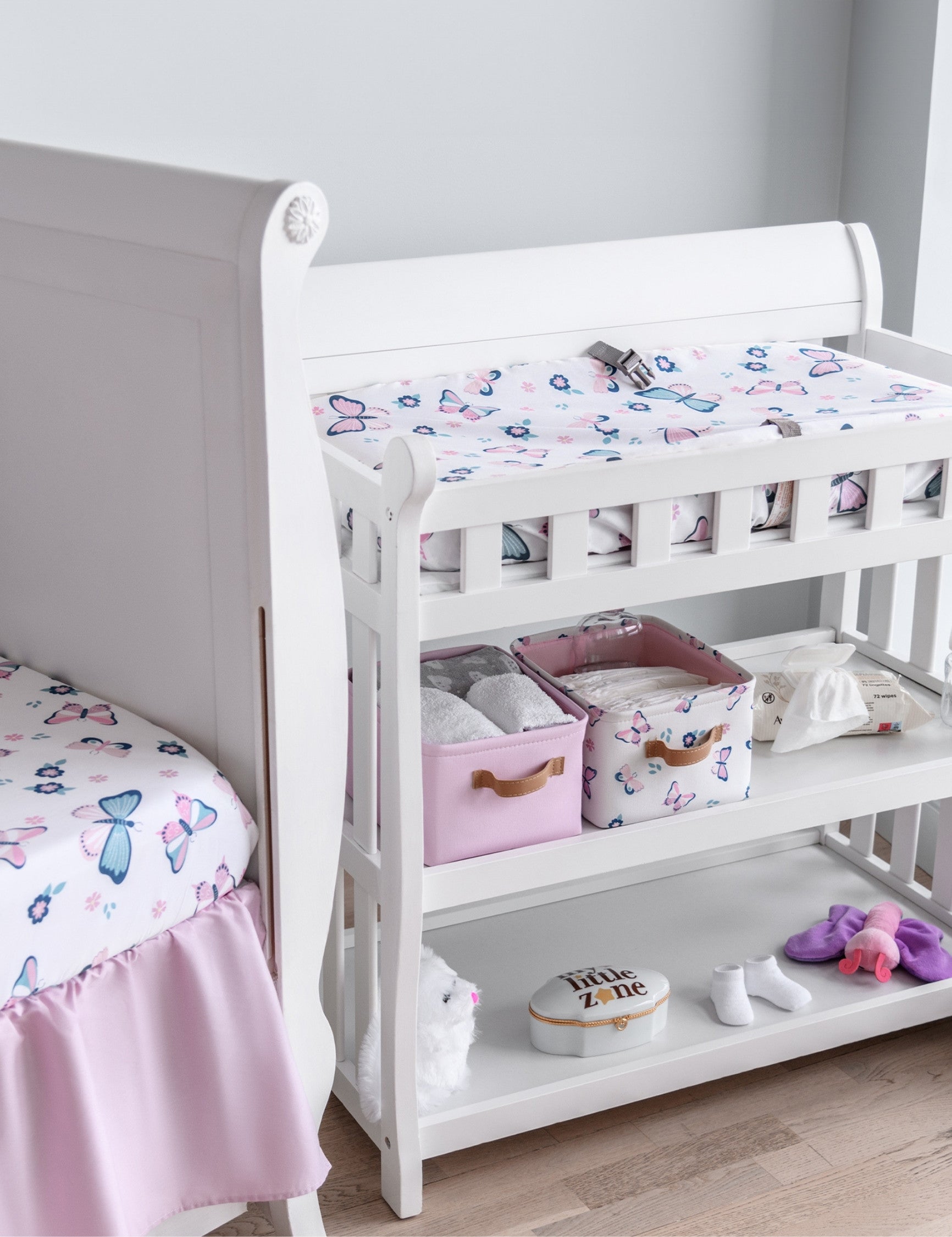Design: Our butterfly diaper changing pad feature a blossom of butterflies in the sweetest, softest tones of pink and lilac. Designed in France, this butterfly changing pad cover is a favorite among parents creating a stylish, butterfly-themed nursery. Beautifully packaged and ready to gift, they make a thoughtful choice for baby showers and baby registry must-haves.