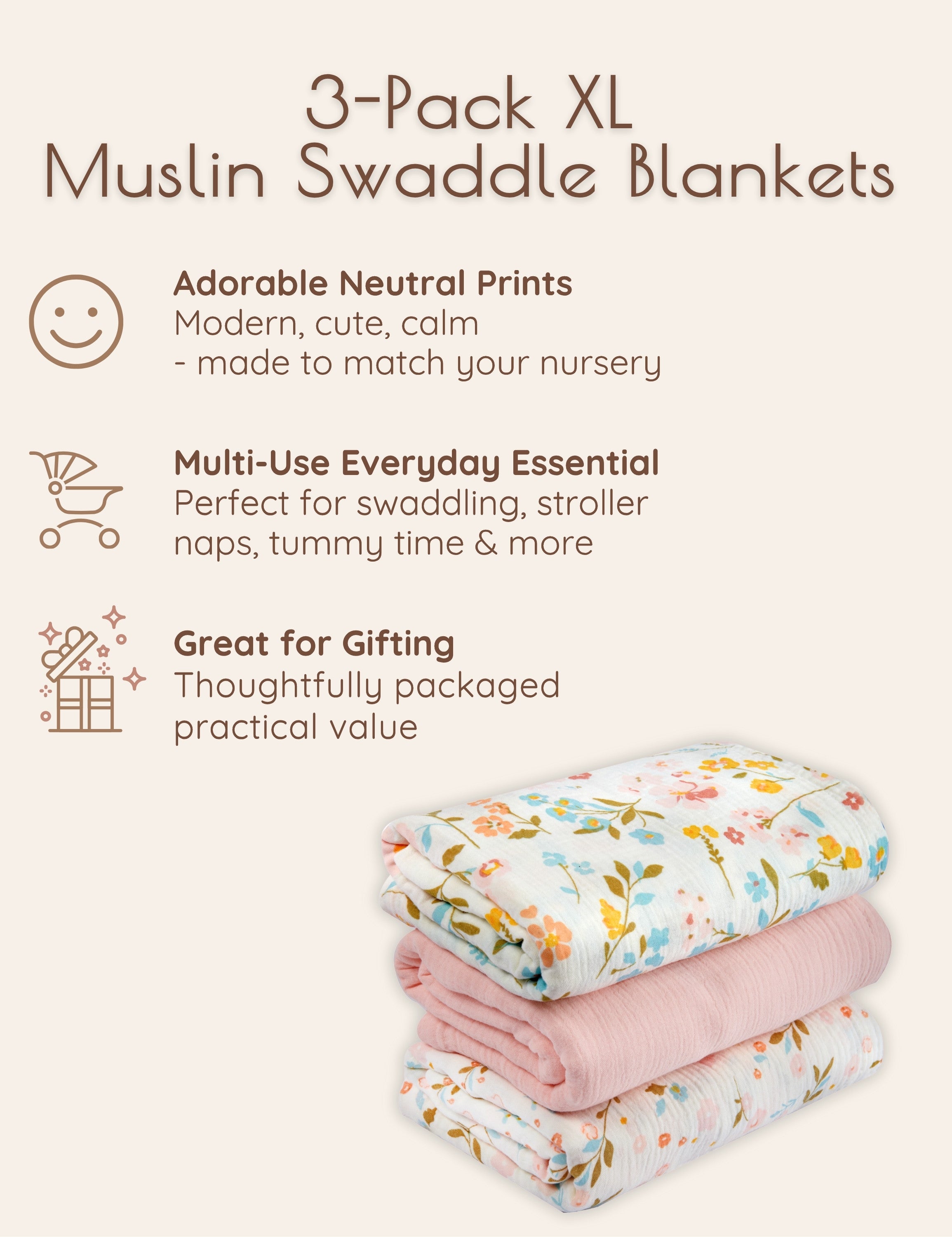My Little Zone - 3-Pack Muslin Swaddle Blankets - Flower Collection