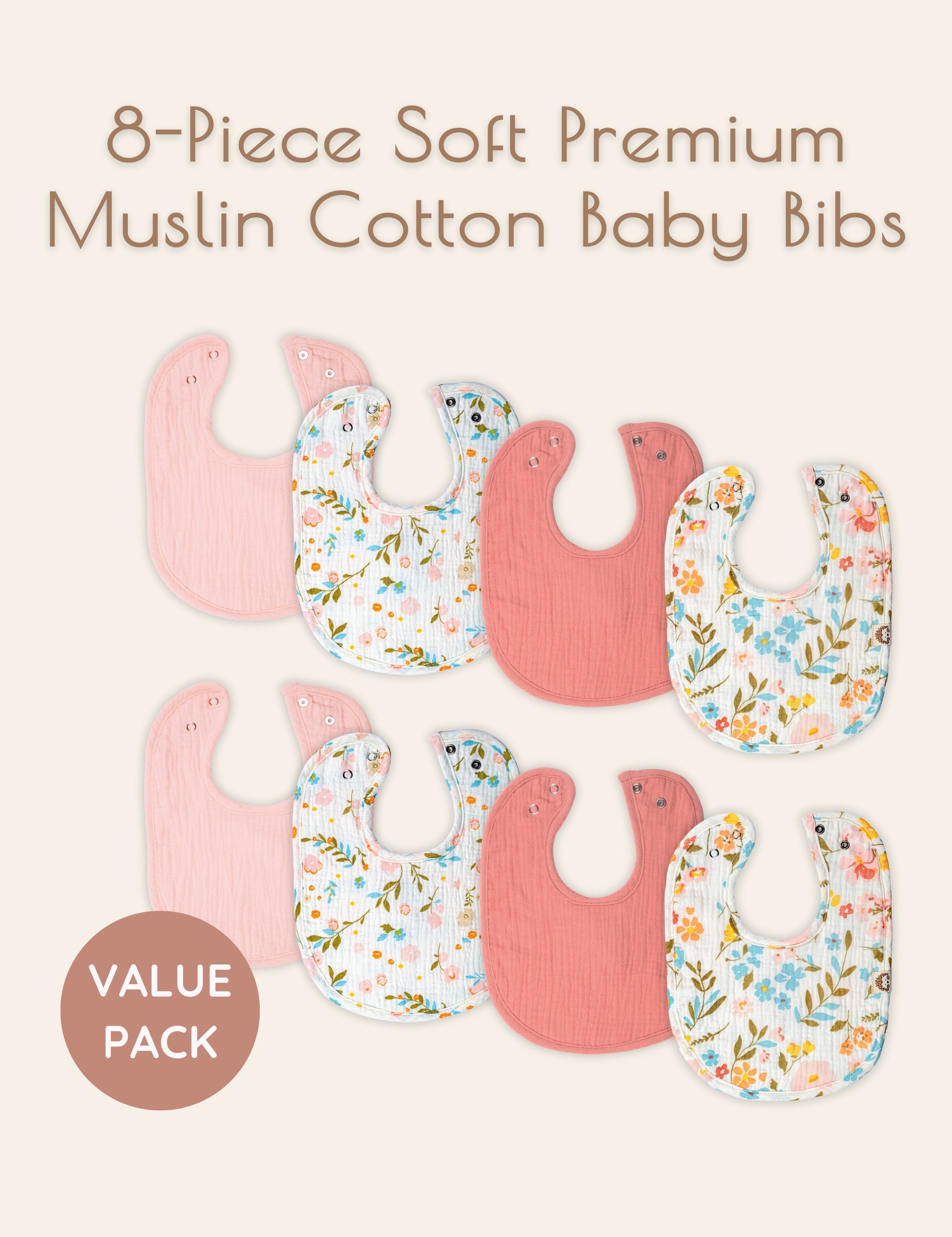 • French Design Muslin Bibs for Baby Girl: Created by a talented French designer, these muslin baby bibs for eating are as stylish as they are practical. The 8-piece muslin bibs set includes four floral bandana bibs for baby girl and four solid pink bandana bibs for baby girl (two light pink baby bibs, two dark pink bandana bibs).