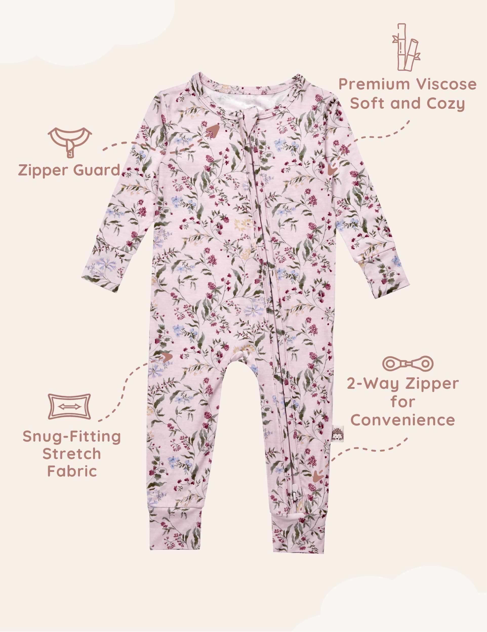 My Little Zone - Baby Footless Zip Front Pajamas - Botanical Collection - Print Pink