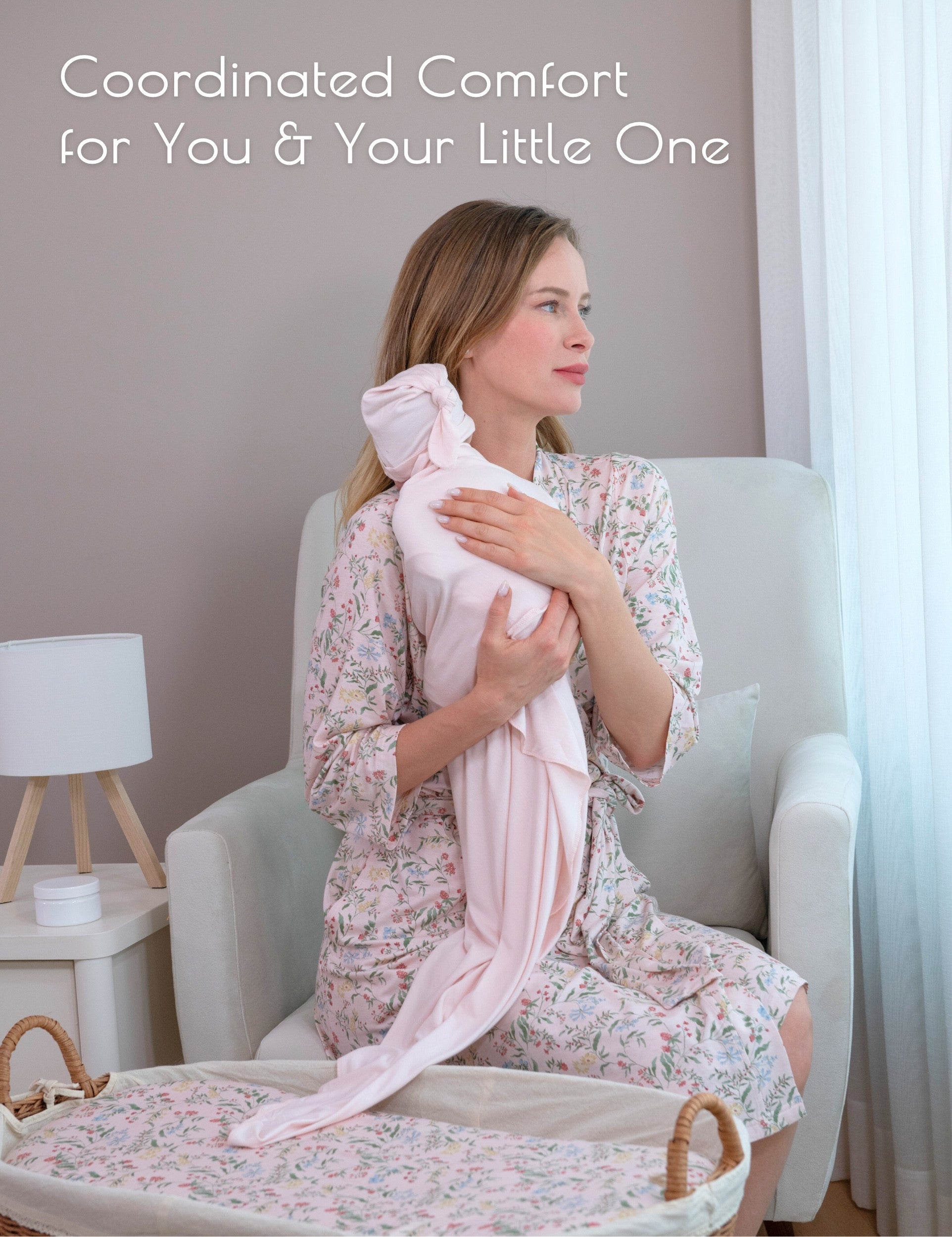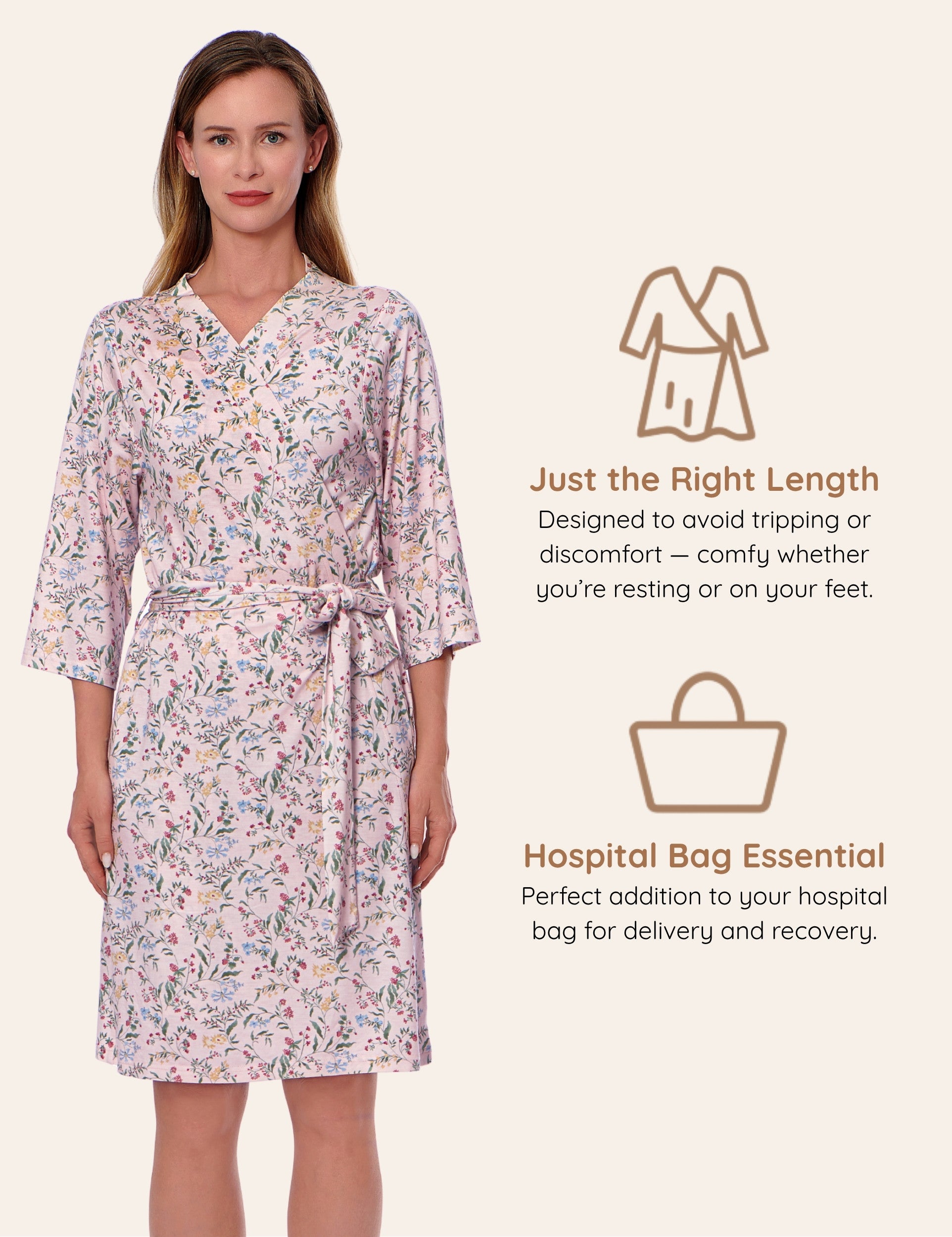 • Designed in France: This elegant pink botanical maternity robe brings together style and function for mothers. This is a perfect bamboo robe for women for pregnancy, postpartum, or as a robe for hospital delivery. This lightweight robe is ideal for all seasons as a part of your labor and delivery essentials. Our maternity robe pairs beautifully with My Little Zone's viscose maternity dress and matches our baby receiving sets and knotted gowns.