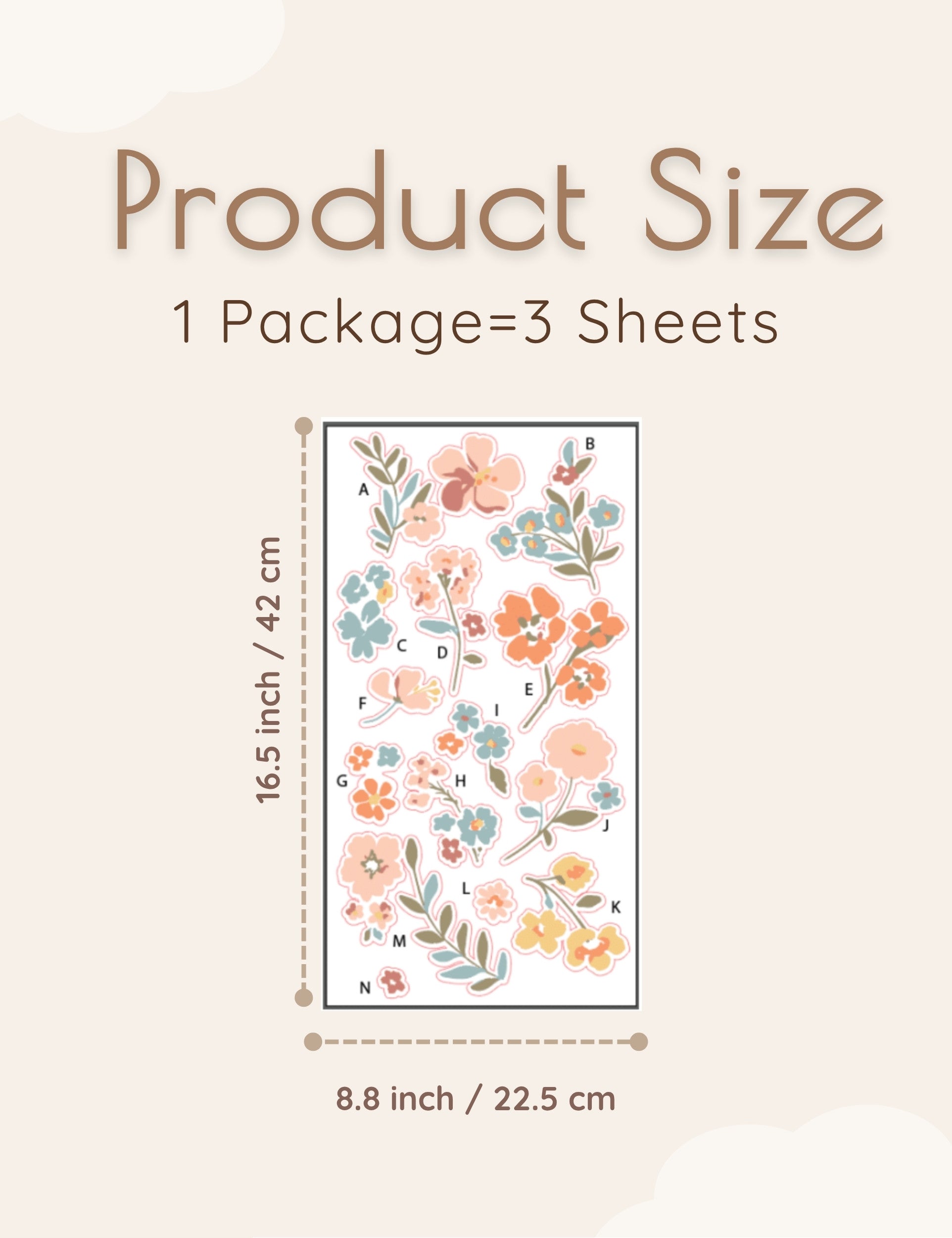 • Flower Wall Decal Instructions: Easy to apply and remove, these nursery wall decals are perfect for decorating kids' rooms, nurseries, or playrooms. The wall decal package includes 3 sheets of the adhesive flower wall decal and an instruction sheet to help you apply the wall decal with ease. Each sticker sheet measures approximately 18" x 11". We recommend using 3 sheets of stickers to cover a vertical wall area of 90" x 25" or a horizontal wall area of 30" x 76". You may follow the reference image of our wall sticker or design your own arrangement to fit your space.