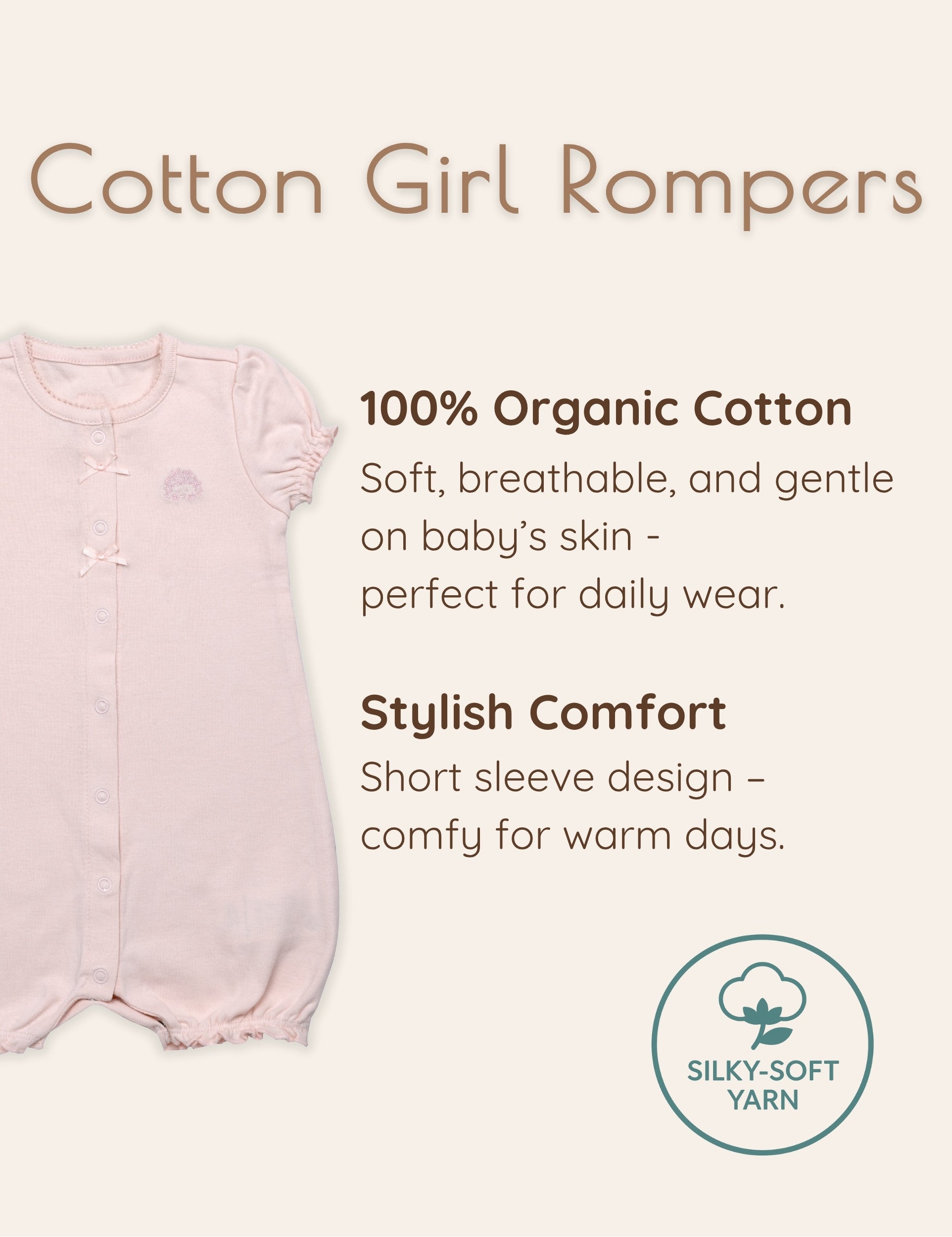 Size Range: Available from newborn to 18–24 months. This organic, pink baby romper provides a soft, flexible bubble romper fit as your baby girl grows, making it an ideal piece of baby girl summer clothes across multiple stages.